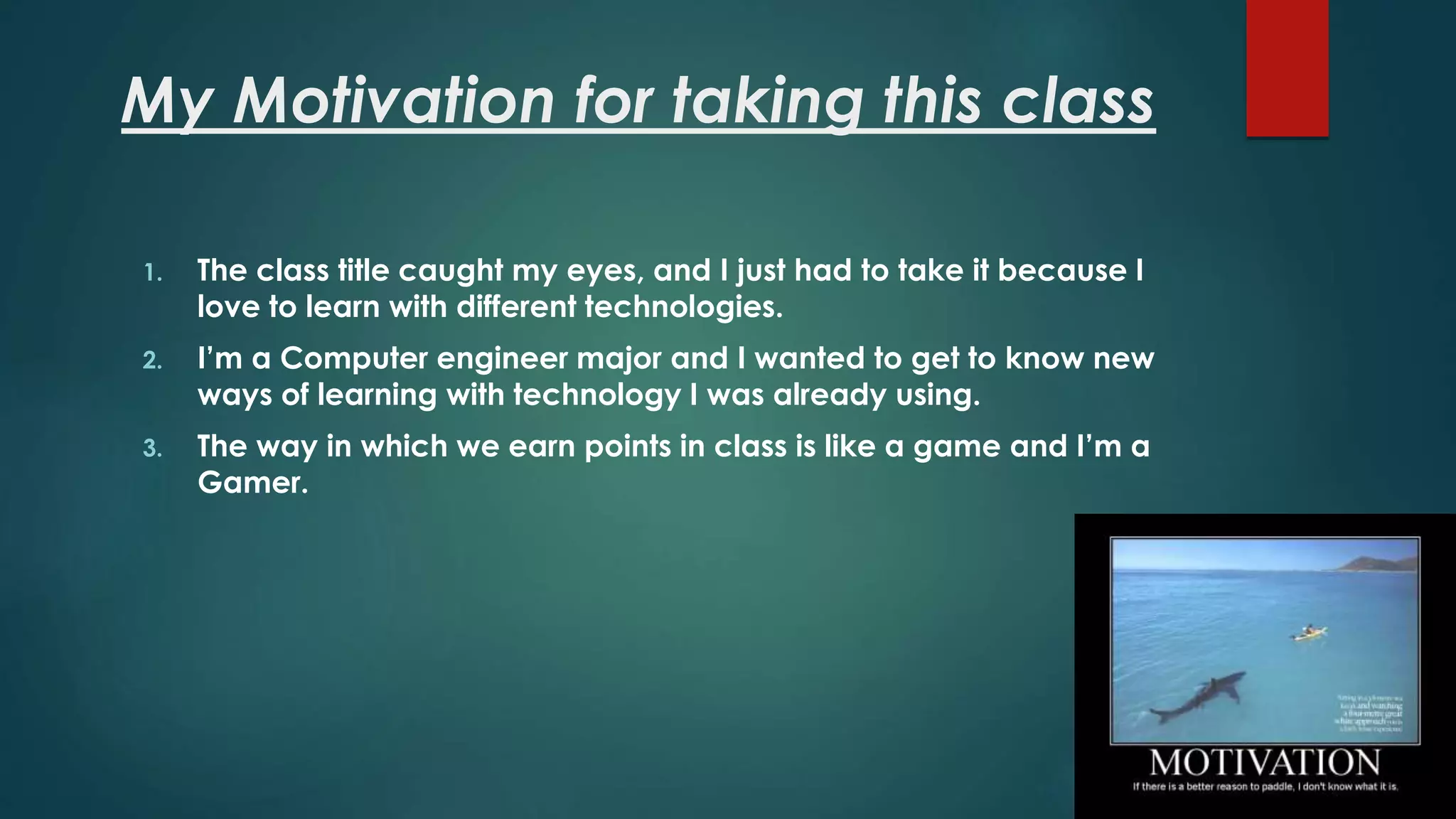Charles took the ITEC 299 class because he was interested in learning new technologies and applying them to improve his learning. As a visual learner, he found apps like Flashcard and Wolfram Alpha helpful for studying calculus. He investigated different technologies like screencasts and discovered how they could support his learning. By understanding his learning preferences and integrating knowledge about physiological learning factors, he was able to improve his sleep, eating, and focus. Charles feels the class experience was helpful for gaining self-awareness about how he learns best using technologies, but that it required a lot of work for the points earned.