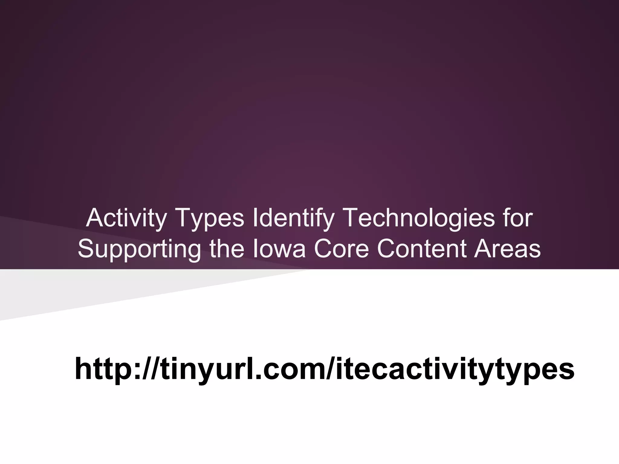 This document provides information and resources for teachers to integrate technology into lessons based on the Iowa Core content areas. It discusses using activity types that pair specific concepts and skills from the Iowa Core with appropriate technologies. A five-step process is outlined for lesson planning that begins with selecting learning goals based on the Iowa Core, choosing learning activities, selecting digital tools, determining how well the tools fit the activities, and rating the level of technology integration. Resources are shared for finding the right digital tools, including lists of activity types supporting the Iowa Core and tools recommended for each type. Rubrics and matrices are also provided for assessing technology integration in lessons.