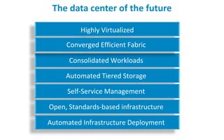 Traditional data centers are proving inflexible for evolving business needs. Virtualization and automation can help optimize infrastructure and reduce costs. Workflow management solutions like Opalis can automate repetitive tasks to free up staff time. A virtual desktop infrastructure using Citrix and Microsoft technologies can centralize desktop workloads for better management while delivering applications using both virtualization and streaming. Bringing together server, desktop, and application virtualization solutions in an integrated approach can optimize infrastructure for the future.