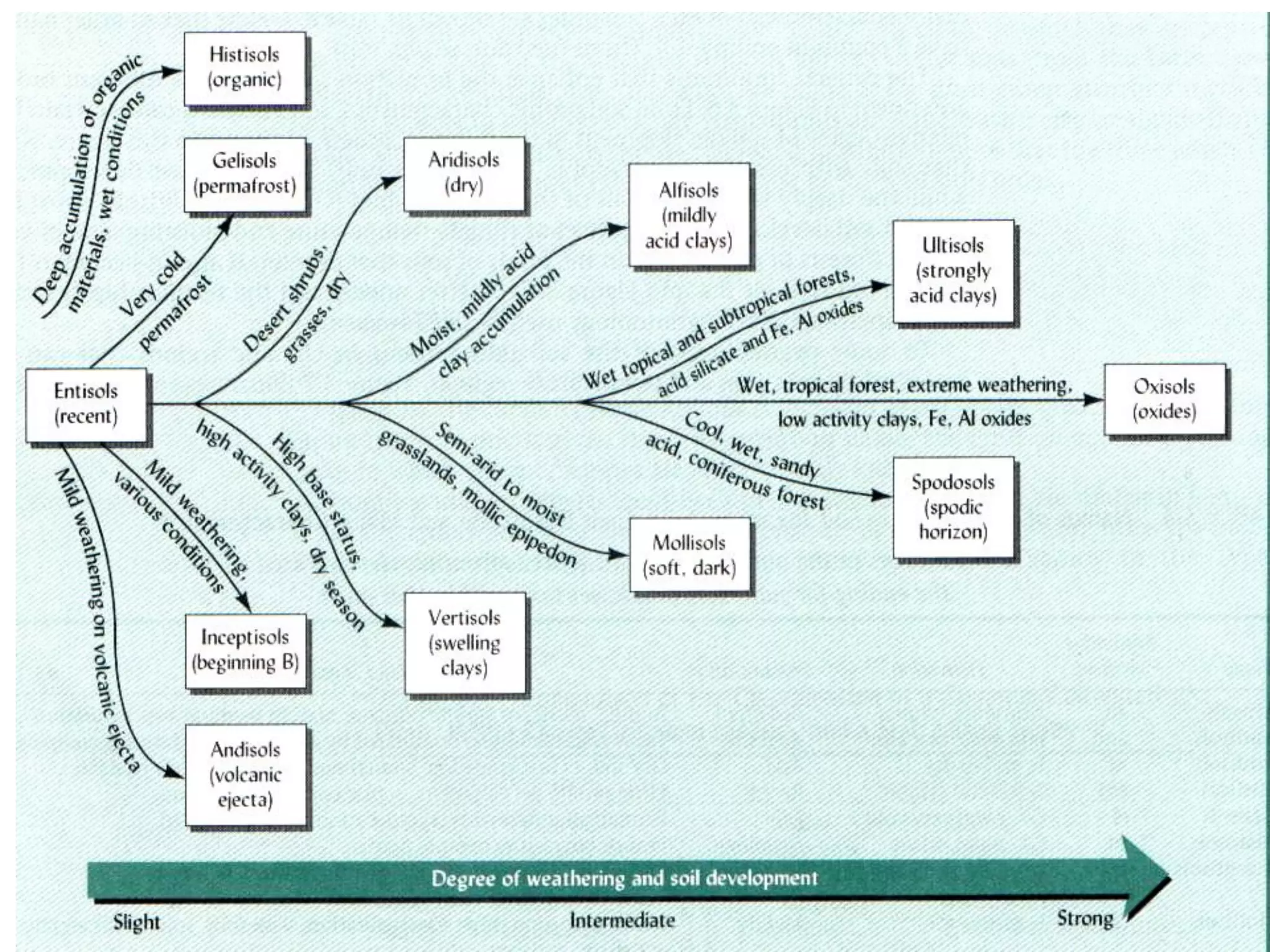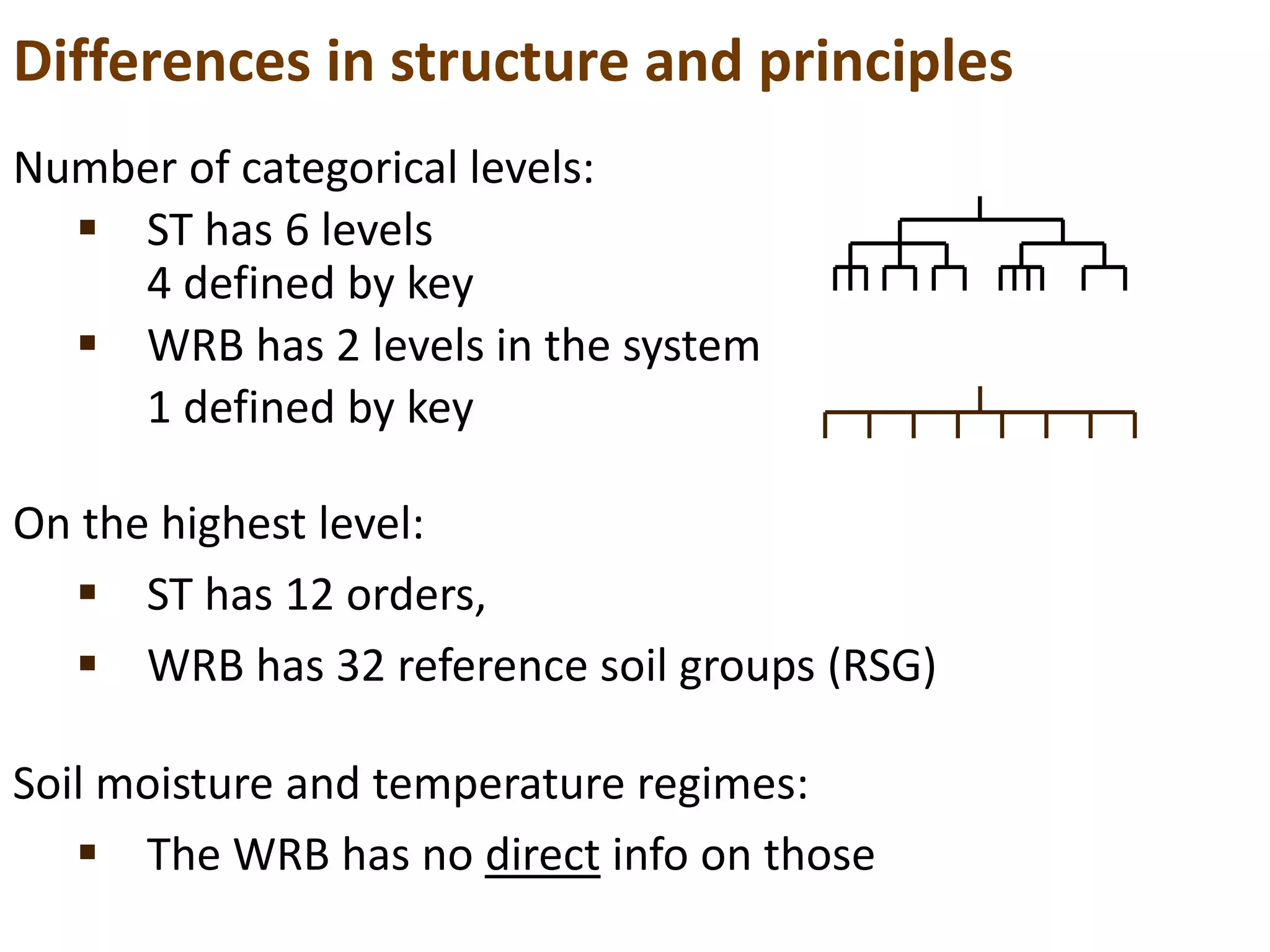 The document discusses soil classification systems, specifically the Soil Taxonomy (ST) and World Reference Base for Soil Resources (WRB), highlighting their structural differences, categorical levels, and characteristics of various soil orders. It details specific soil types such as Entisols, Histosols, Gelisols, Andisols, and others, along with their geographic distribution, physical properties, and ecological significance. The classification process using diagnostic rules and qualifiers for soil description is also outlined.