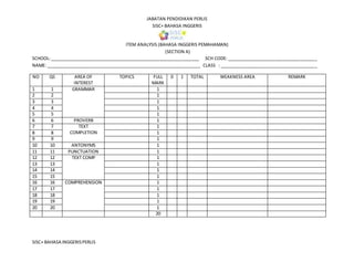 This document contains 3 sections summarizing an English language assessment of students. Section 1 lists 20 multiple choice comprehension questions assessing various topics. Section 2 lists 5 short answer questions with subparts on comprehension. Section 3 contains analysis of students' writing scores, dividing the assessment into sections on format, content, and overall performance. The document aims to analyze student weaknesses by question topic for both reading and writing.