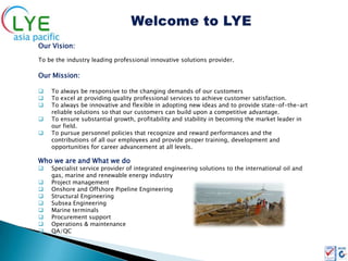 This document outlines the vision, mission, services, and capabilities of an engineering solutions provider. Their vision is to be the leading innovative solutions provider in their industry. Their mission involves being responsive to customers, providing quality services, adopting new ideas, ensuring growth and rewarding employees. They specialize in integrated engineering solutions for oil, gas, marine, and renewable energy. Their services include project management, pipeline engineering, structural engineering, and more.
