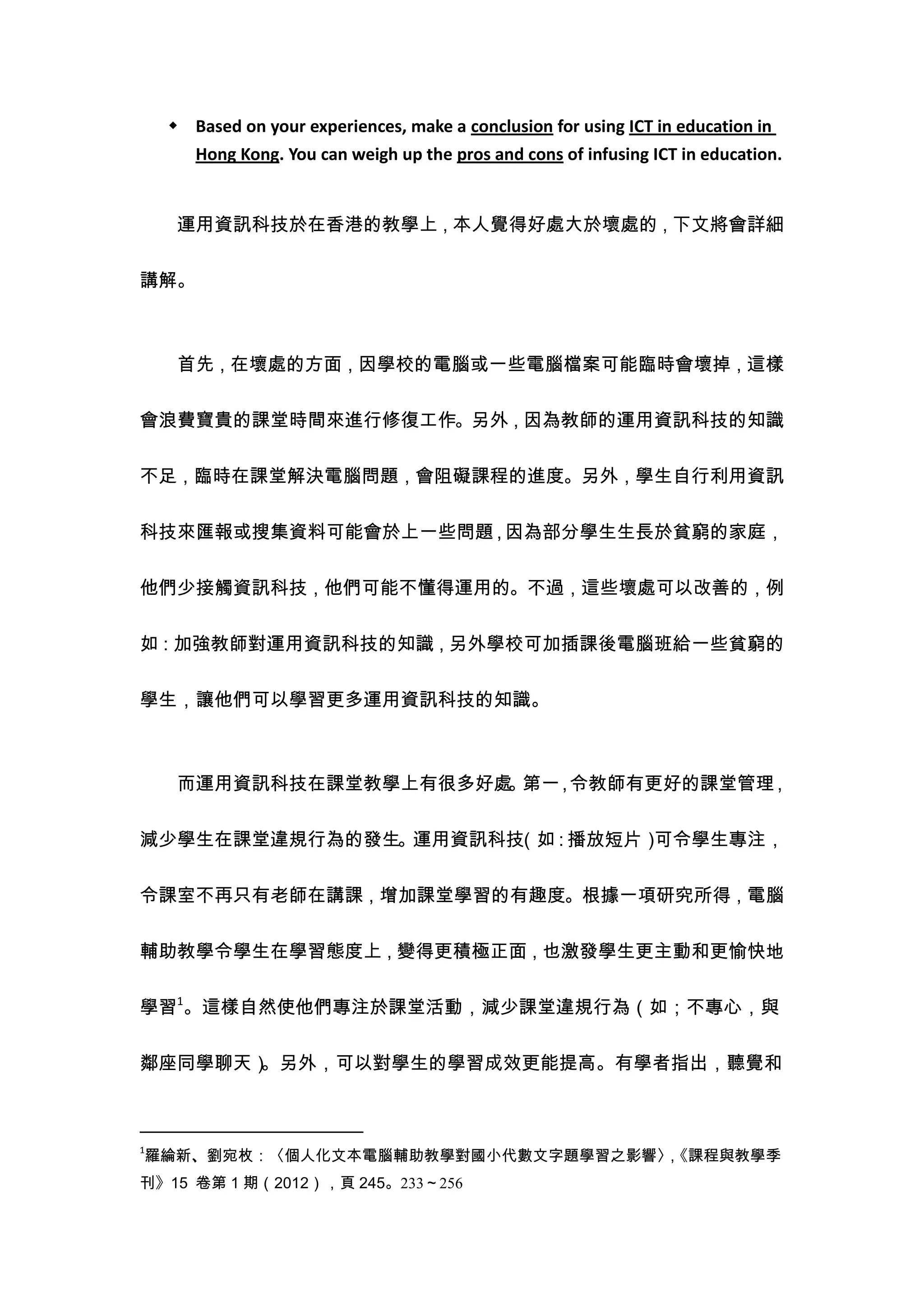 Hong Kong. You can weigh up the pros and cons of infusing ICT in education.
