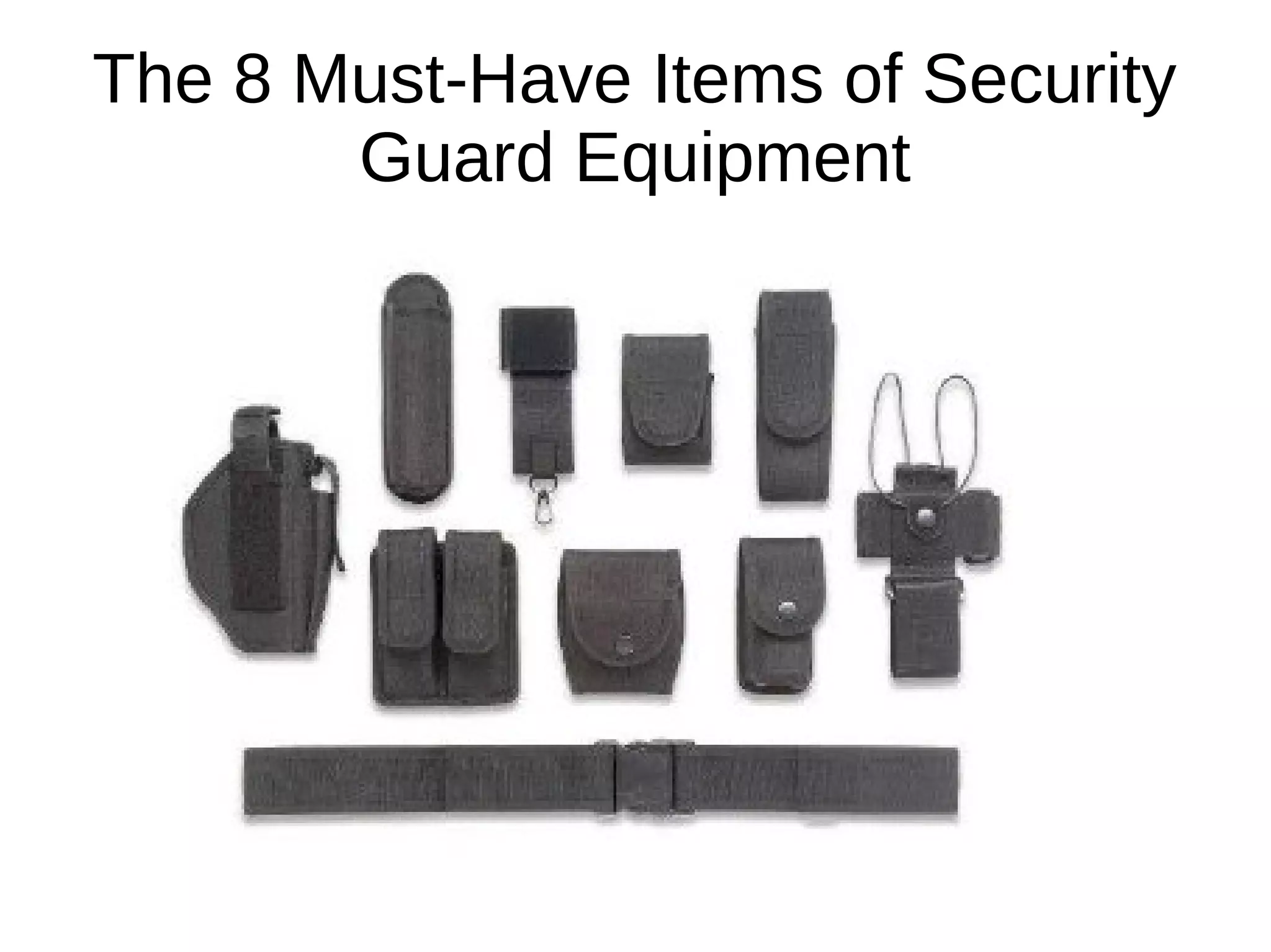 The 8 Must-Have Items of Security Guard Equipment document outlines essential equipment for security guards which includes: 1) A bullet-proof vest and high-visibility clothing for protection and visibility. 2) A flashlight is essential even during day shifts. 3) Self-defense tools like pepper spray, batons or guns to prevent attacks. 4) A camera to document events. 5) A notepad and pen to record reports and observations. 6) A two-way radio for communication though smartphones now also provide this. 7) A mobile phone for quick access to emergency contacts. 8) A heavy-duty belt to carry all the security equipment.