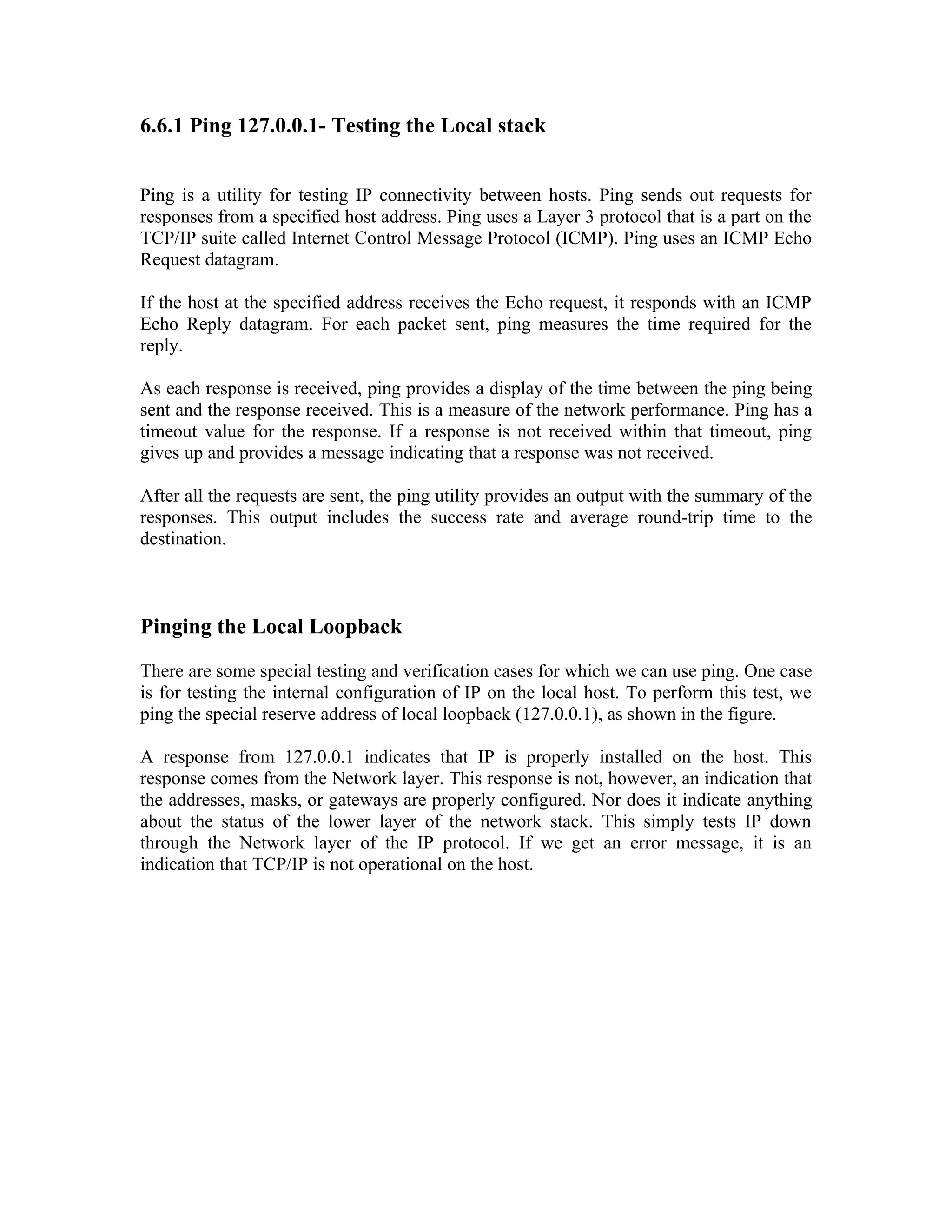 This document provides instructions for using the ping and traceroute commands to test TCP/IP network connectivity. It describes pinging the local loopback address and default gateway to verify local IP stack functionality. Traceroute is used to identify the network path and devices between the local host and a remote server, and can help locate connectivity issues along the path. The lab demonstrates using these commands on the local host to test connectivity to on-link and off-link devices and networks.
