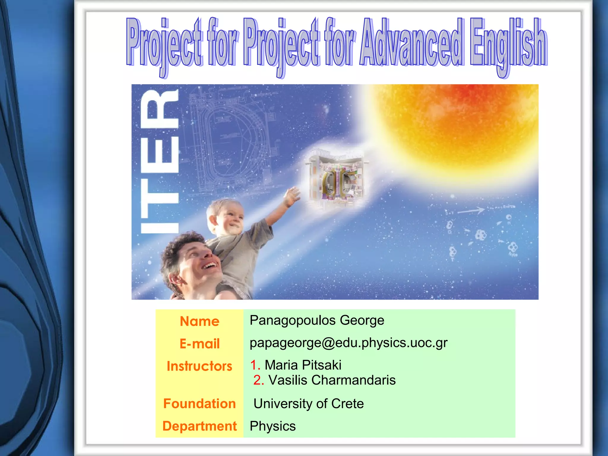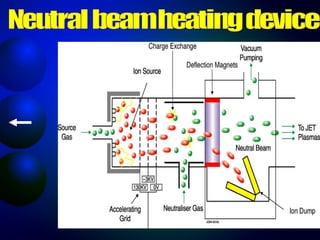 This document discusses nuclear fusion as a source of energy. It provides an overview of fusion, including what it is, the conditions needed to achieve it, and its safety advantages over other energy sources. ITER is introduced as a large-scale international project working to develop fusion as an energy source. Key points covered include how deuterium and tritium are used as fuel, the extremely high temperatures required to fuse atomic nuclei, and how magnetic confinement is used to control the plasma within the reactor.