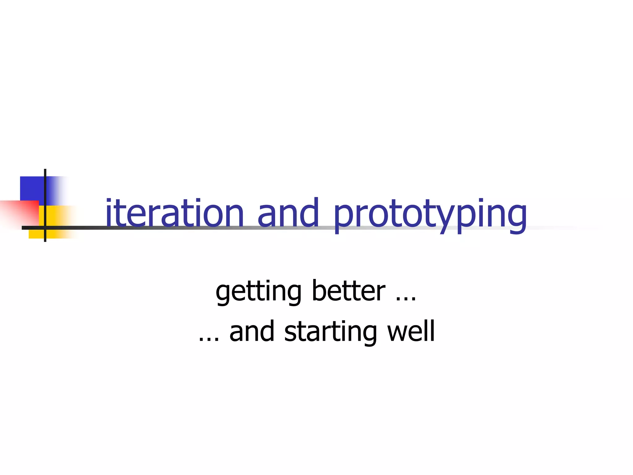 The document discusses prototyping techniques for software development. It defines prototyping as an essential element of user-centered design that involves testing design ideas with users early in the development process. Different types of prototyping are appropriate for different stages, from paper-based prototypes to test initial ideas to software-based prototypes that provide limited functionality for further testing. The goal of prototyping is to identify and address design errors and user requirements before significant development effort.