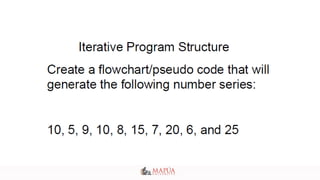 The document outlines two tasks for creating iterative program structures. The first task involves generating a specific number series (1, 2, 4, 7, 11, 16, 22, 29, 37, 46) using a flowchart or pseudocode. The second task requires devising a flowchart or pseudocode to input five numbers and determine how many of those numbers are odd or even.