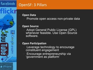 Gov 2.0 emphasizes transparency, participation, and collaboration through open data and open source initiatives. It advocates for using technology to enhance constituent engagement and entrepreneurship, positioning government as a platform for innovation. The document highlights the importance of making government data accessible and encourages the adoption of open participation and open-source software in governmental policies.