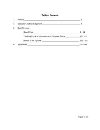 The document provides a summary of three books that review ethics in technology and cyberspace. It discusses key topics in each book such as the evolution of information technology, the need for computer ethics to ensure fairness, and special characteristics of online communication like scope, anonymity and reproducibility. The reviews highlight how information technology has transformed tasks worldwide, the importance of ethics for proper conduct, and how characteristics of online communication can impact society. Lessons learned are that computer use is widespread and ethics help establish fairness and equality when using technology.