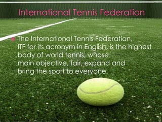 The International Tennis Federation (ITF) is the highest governing body of tennis. It oversees tennis competitions at all levels, from Grand Slams and Olympics to lower-level Futures tournaments. The ITF was founded in 1913 with 12 founding member nations and has since helped establish tennis facilities in over 90 developing countries through grants.