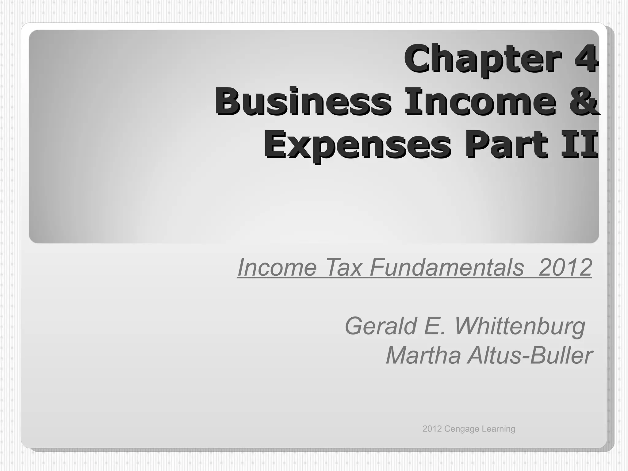 This document discusses various tax rules related to business income and expenses, including rental properties, passive income/losses, retirement plans, and itemized deductions. It provides learning objectives and then covers topics like rental income treatment, the dual use of vacation homes for personal and rental purposes, passive loss limitations, self-employed health insurance deductions, and contribution and distribution rules for IRAs and retirement plans. Examples are provided to illustrate concepts like calculating the deductible portion of rental real estate losses.