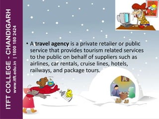 A travel agency acts as an intermediary between customers and suppliers of travel services like airlines and hotels. They sell travel products and services on behalf of suppliers and make a profit from the difference between the discounted price they receive and the advertised price customers pay. Travel agencies have departments for marketing, reservations, documentation, and more. Tour operators design and sell packaged travel products directly to customers or through travel agencies.