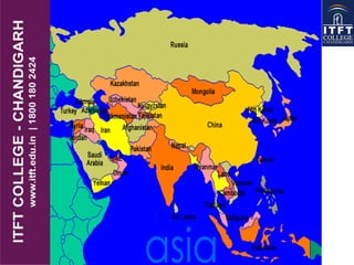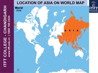 Asia is the largest continent, covering 29.9% of the Earth's land area and home to approximately 4 billion people, representing 60% of the global population. It consists of 49 countries and features diverse geographical regions, climates, and cultures, including significant landscapes like the Himalayas and the Gobi Desert. The continent also hosts major economic activities and a multitude of religions, while facing challenges such as poverty and population density.