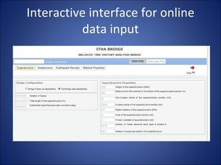 This document describes an interactive interface for performing inelastic time history analysis of highway bridges using OpenSees. The interface allows for online input of bridge parameters and models and generates 3D OpenSees models that can simulate the inelastic response of bridges under multiple earthquake records. It then returns a full report of the simulations by email.