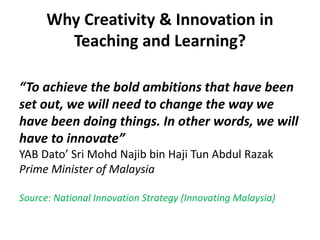 The document discusses the i-think program launched in Malaysia to enhance creativity and innovation in teaching and learning, focusing on developing higher order thinking skills using visual thinking tools like thinking maps. It emphasizes the implementation of a whole school approach with training for teachers and students to improve learning outcomes. The program aims to transform educational practices by fostering a consistent visual language in classrooms across the nation.