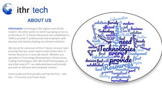 IT Human Resources is a recruitment firm that specializes in providing IT professionals and employers with recruitment solutions across the IT sector. They recruit for every part of IT, including technology development, infrastructure, trading technologies, SAP, Microsoft technologies, and more. The firm ensures that clients will never need to look further for recruitment needs. They have dedicated teams to provide efficient and compliant solutions for clients.