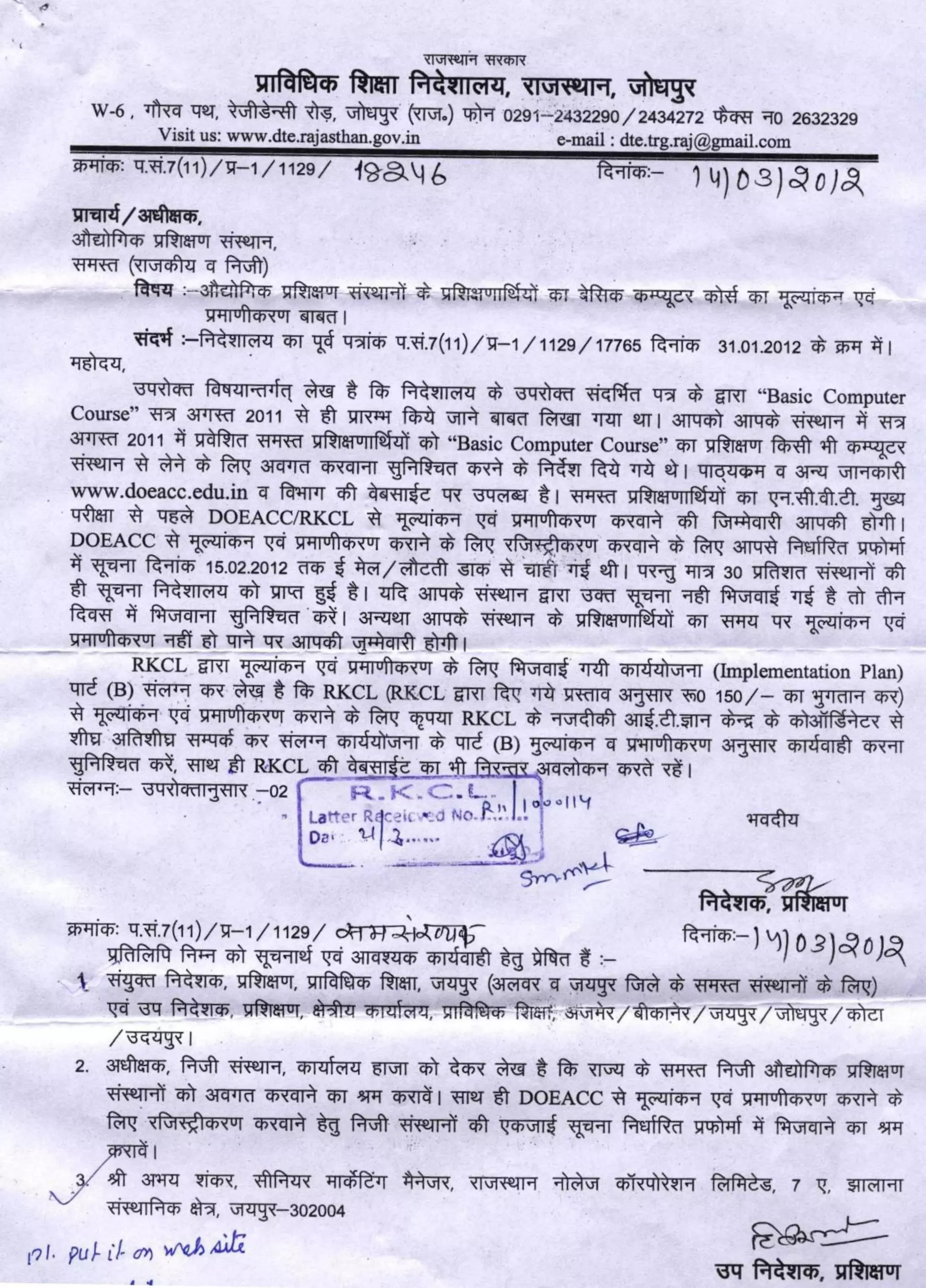 ITI Order for Exam by RKCL