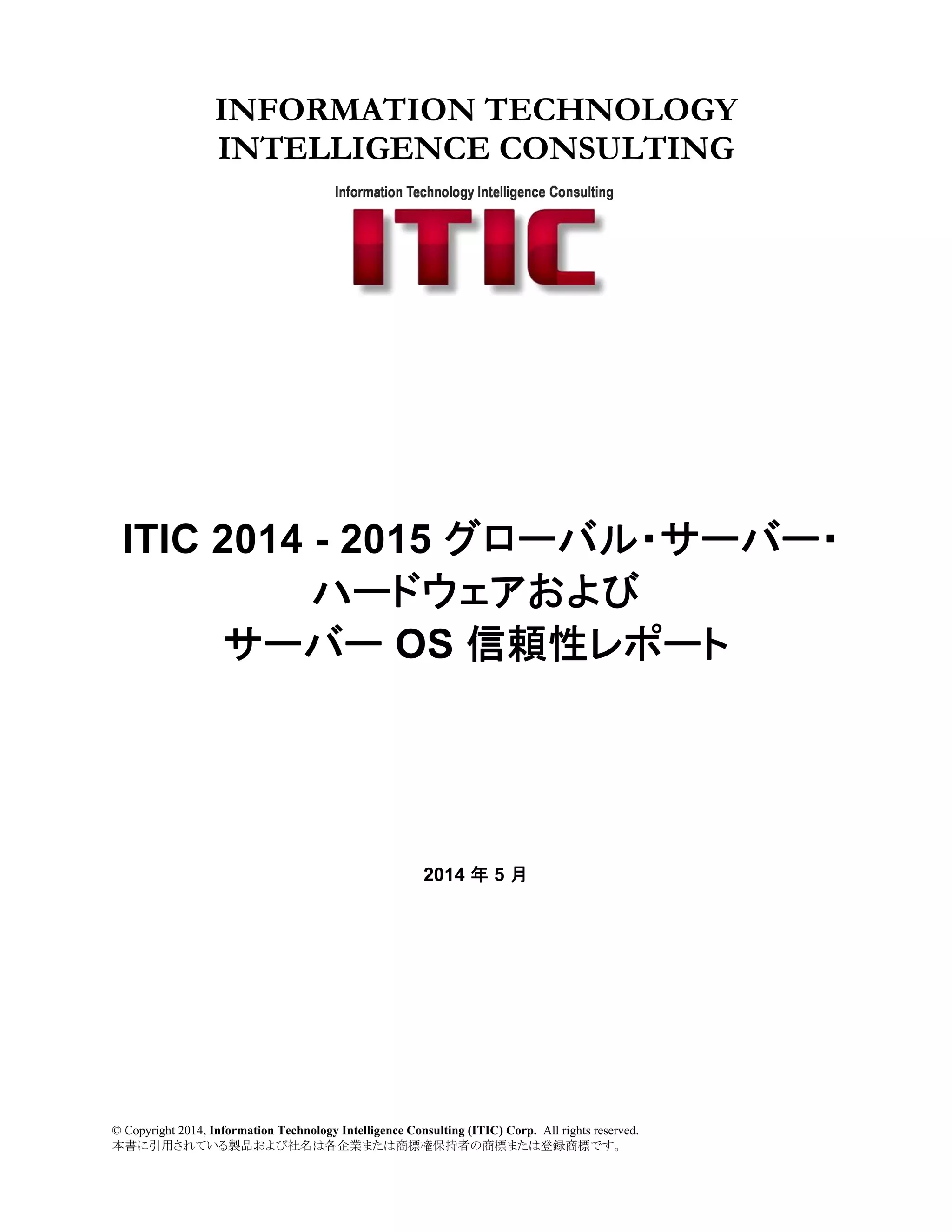 Information Technology Intelligence Consulting (ITIC) Corp. All rights reserved. 本書に引用されている製品および社名は各企業または商標権保持者の商標または登録商標です。 INFORMATION TECHNOLOGY INTELLIGENCE CONSULTING ITIC 2014 - 2015 グローバル・サーバー・ ハードウェアおよび サーバー OS 信頼性レポート 2014 年 5 月