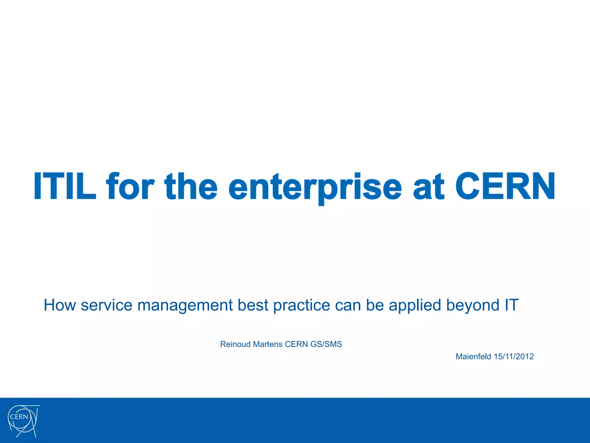 The document discusses how service management best practices used in IT can be applied more broadly at CERN, a large particle physics research organization. It provides context on CERN, including its missions, facilities like the Large Hadron Collider, and challenges. It describes CERN's service management environment, covering many different types of services across the organization. It outlines the project to implement a service management approach at CERN, including defining services, processes, and structures. The goal is to bring more maturity and efficiency to managing CERN's diverse infrastructure and services through an established framework.