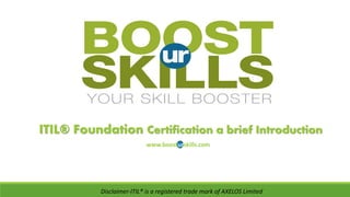 The document provides an overview of the ITIL® Foundation Certification, highlighting its importance in IT service management and the best practices it encompasses. It outlines the certification structure, eligibility criteria, and training benefits offered by BoostUrSkills, emphasizing the skills gained from experienced trainers. Additionally, it details the exam format and scoring requirements for certification candidates.