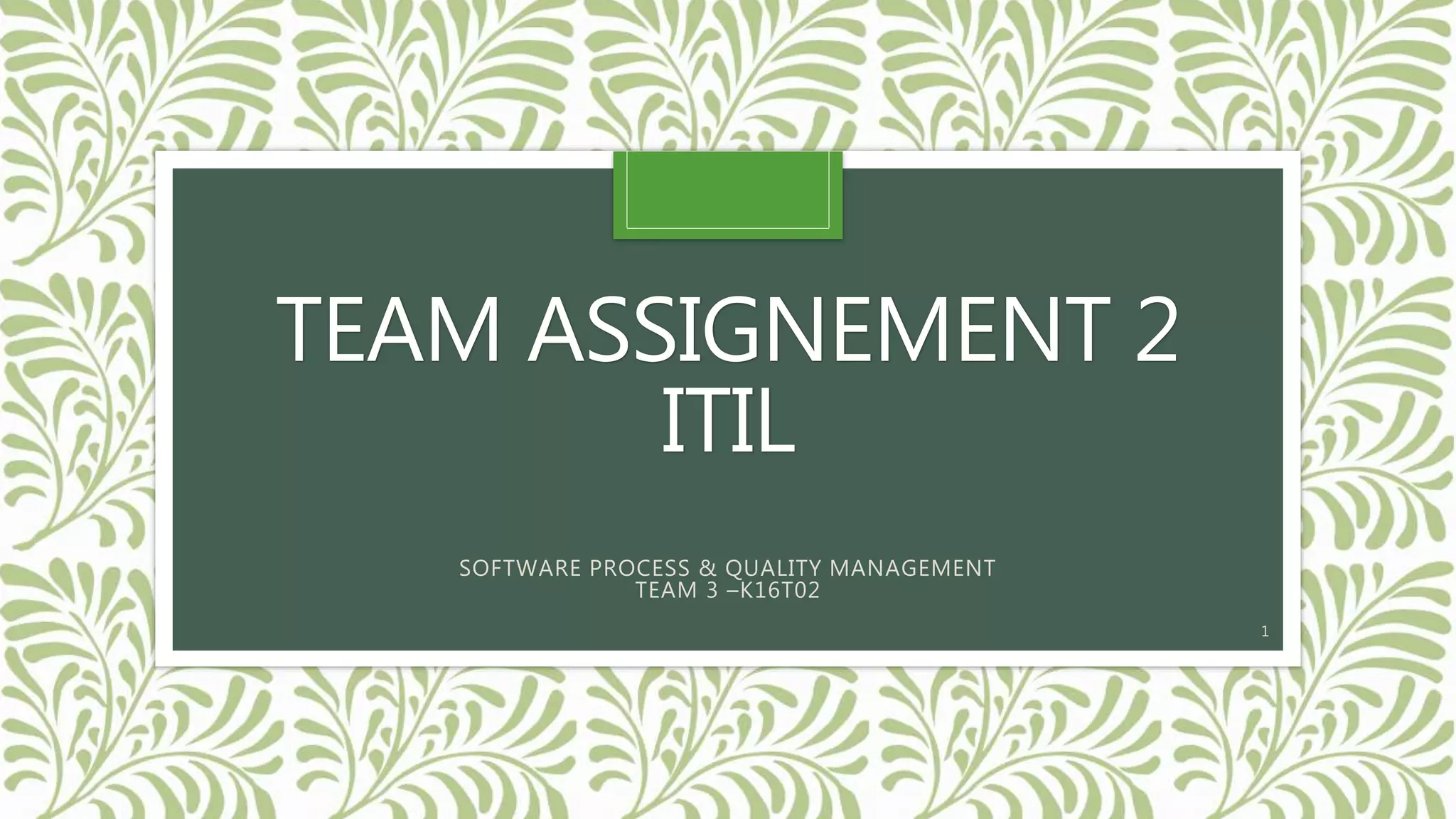 The document provides an overview of Team 3's assignment on ITIL software process and quality management. It includes an introduction to ITIL, the team members, and covers various ITIL concepts like the service lifecycle, ITIL benefits, certification levels, and processes for service strategy, design, transition, operation, and continual service improvement.