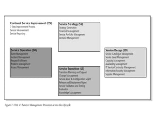 The document provides an overview of ITIL (IT Infrastructure Library), including its background, core concepts, and service lifecycle framework. ITIL is a best practice framework for IT service management that was published by the UK government. It describes five stages of the service lifecycle - service strategy, design, transition, operation, and continual service improvement. Each stage involves key processes to manage the planning, delivery, and improvement of IT services. The document also outlines some important ITIL roles and qualifications.