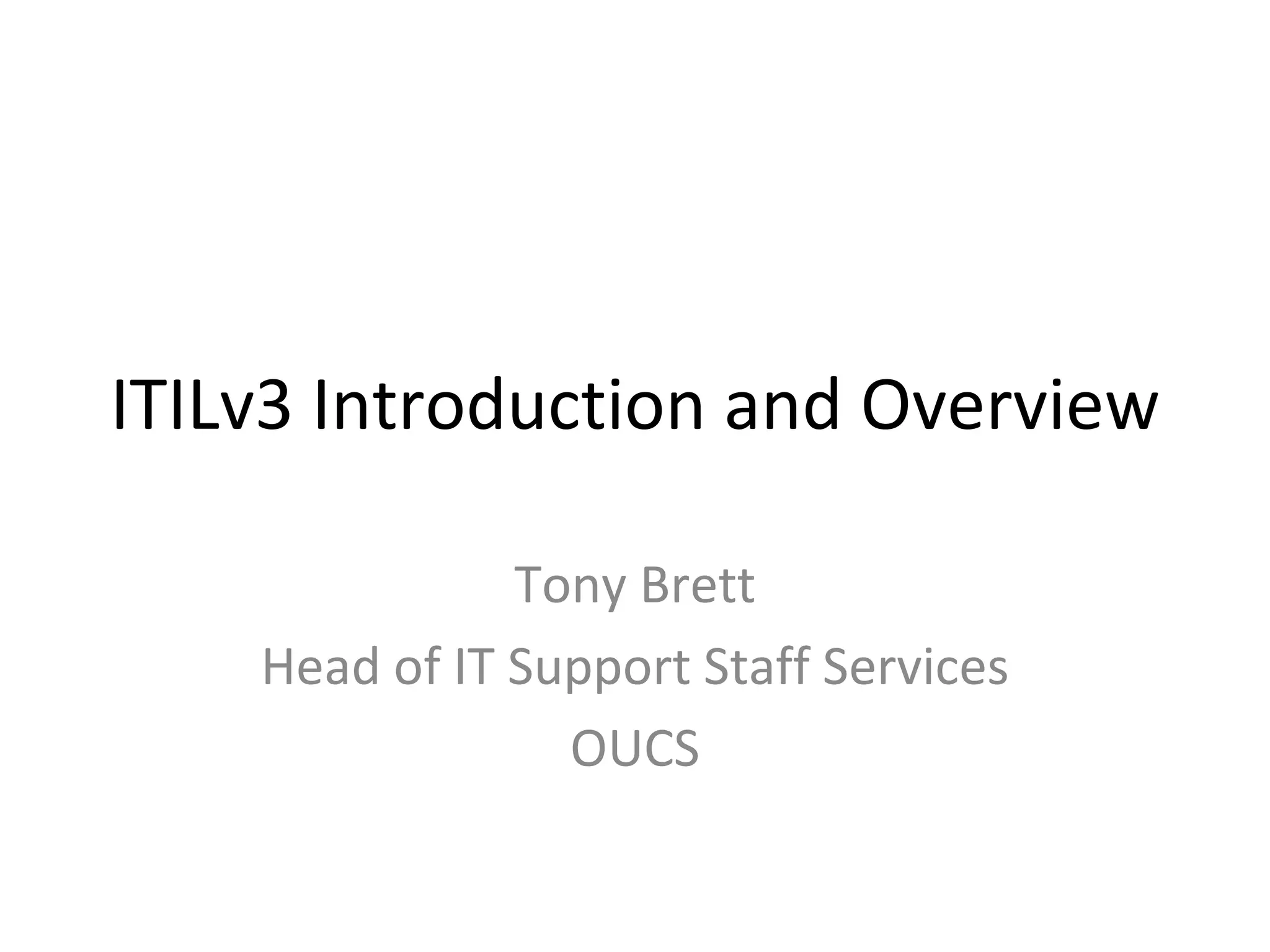 The document provides an overview of ITIL (Information Technology Infrastructure Library) version 3. It discusses what ITIL is, the key enhancements in version 3 compared to previous versions, and some of the main concepts and components of the ITIL service lifecycle framework including service strategy, design, transition, operation, and continual service improvement.