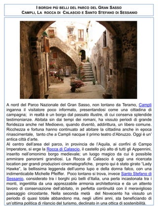 Il documento descrive itinerari suggestivi in Abruzzo, Basilicata, Calabria e Campania, evidenziando parchi naturali, borghi storici e tradizioni culinarie. Attrazioni come il Parco Nazionale del Gran Sasso, le città storiche di Matera e Catanzaro, e la produzione di mozzarella di bufala sono enfatizzate. Ogni regione è presentata come una fusione di bellezze naturali, cultura e gastronomia, offrendo esperienze autentiche per i visitatori.