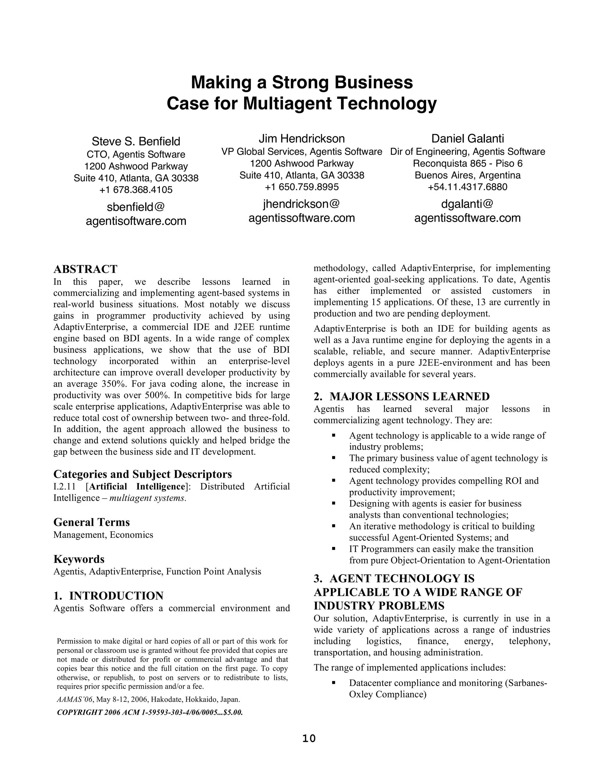 This document discusses making a business case for using multiagent technology. It describes lessons learned from implementing 15 commercial agent-based applications across various industries. Key findings include that agent technology reduces complexity, improves productivity by 350-500%, and can reduce total project costs by 2-3x. The primary business value is managing complex, changing requirements. Measuring ROI is difficult but agent approaches show compelling gains in programmer productivity.