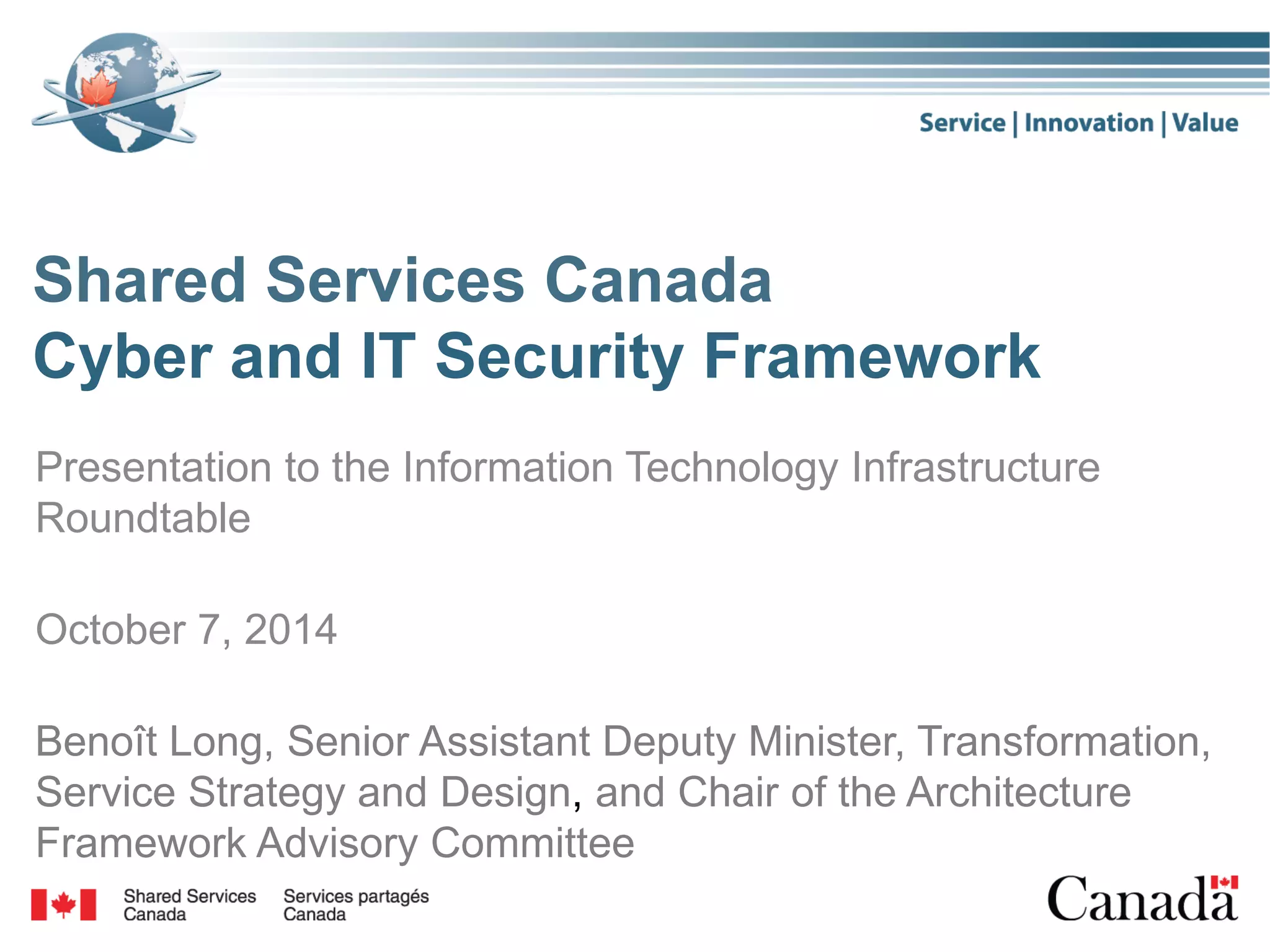 The presentation outlines Shared Services Canada's cyber and IT security framework, highlighting the importance of integrated risk management and enhanced protection measures for infrastructure and data. It details the current state of security solutions versus the targeted end state, emphasizing the need for unified systems and improved incident response capabilities. The discussion concludes with a focus on security principles, a gradual shift towards advanced security models, and next steps for implementation and governance.