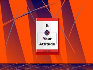 This document summarizes Luis G. Lobo's book "It IS Your Attitude" which discusses developing a positive attitude. It outlines that the success or failure of any organization depends on engaged leadership. It discusses how attitudes are formed through example, lack of leadership, and non-reality based thinking. It provides tips for developing a positive attitude including self-coaching, dismissing untrue beliefs, reading to learn, getting involved communally, and being kind to yourself and others. It encourages developing an enthusiastic positive attitude coupled with personal ownership of success.