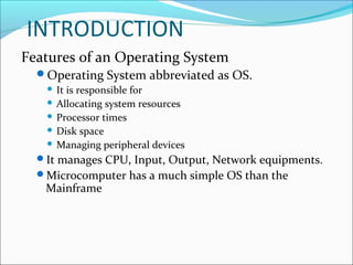 The document discusses the key features and functions of operating systems. It describes how operating systems allocate resources, manage devices and memory, and allow multiple programs to run simultaneously. Examples are given of some popular operating systems for microcomputers, minicomputers and mainframes. The functions of an operating system include input/output management, memory management, file management, and human-computer interfacing. Popular modern operating systems like Windows, Mac OS, Linux, and UNIX are also overviewed.