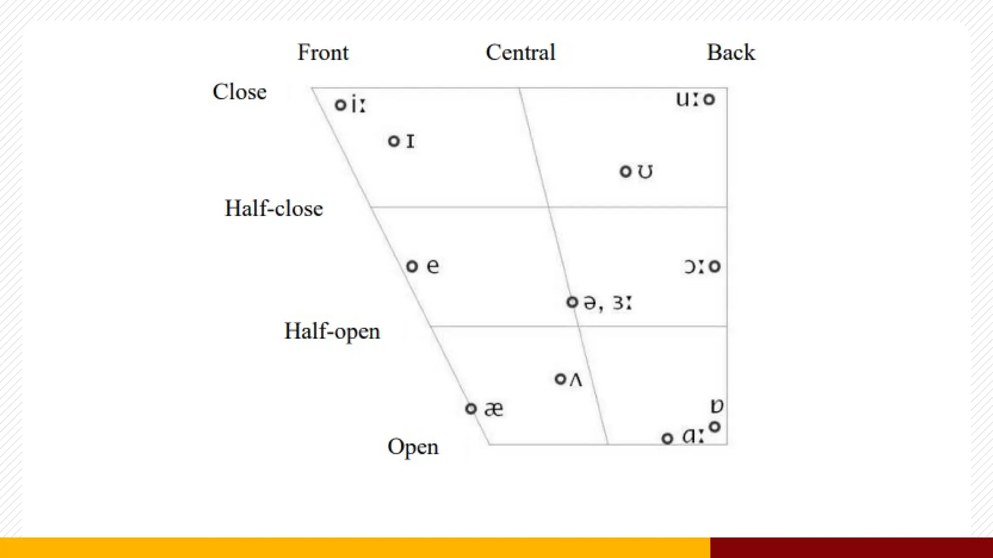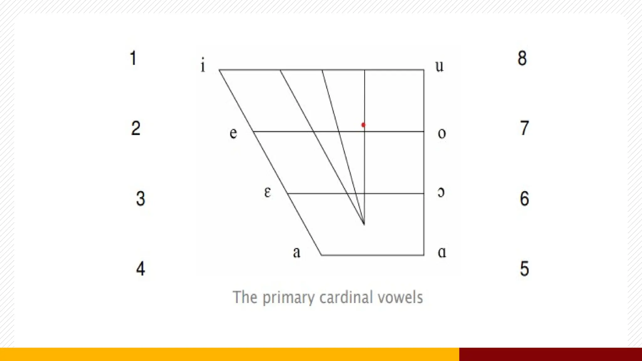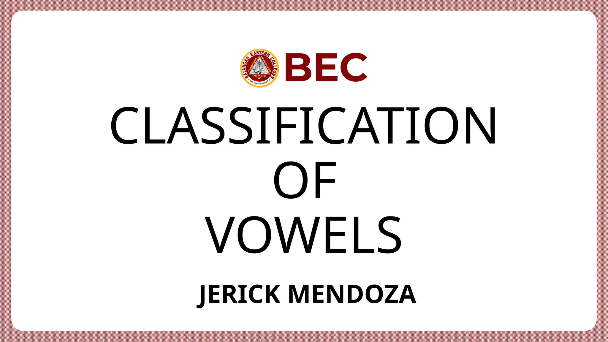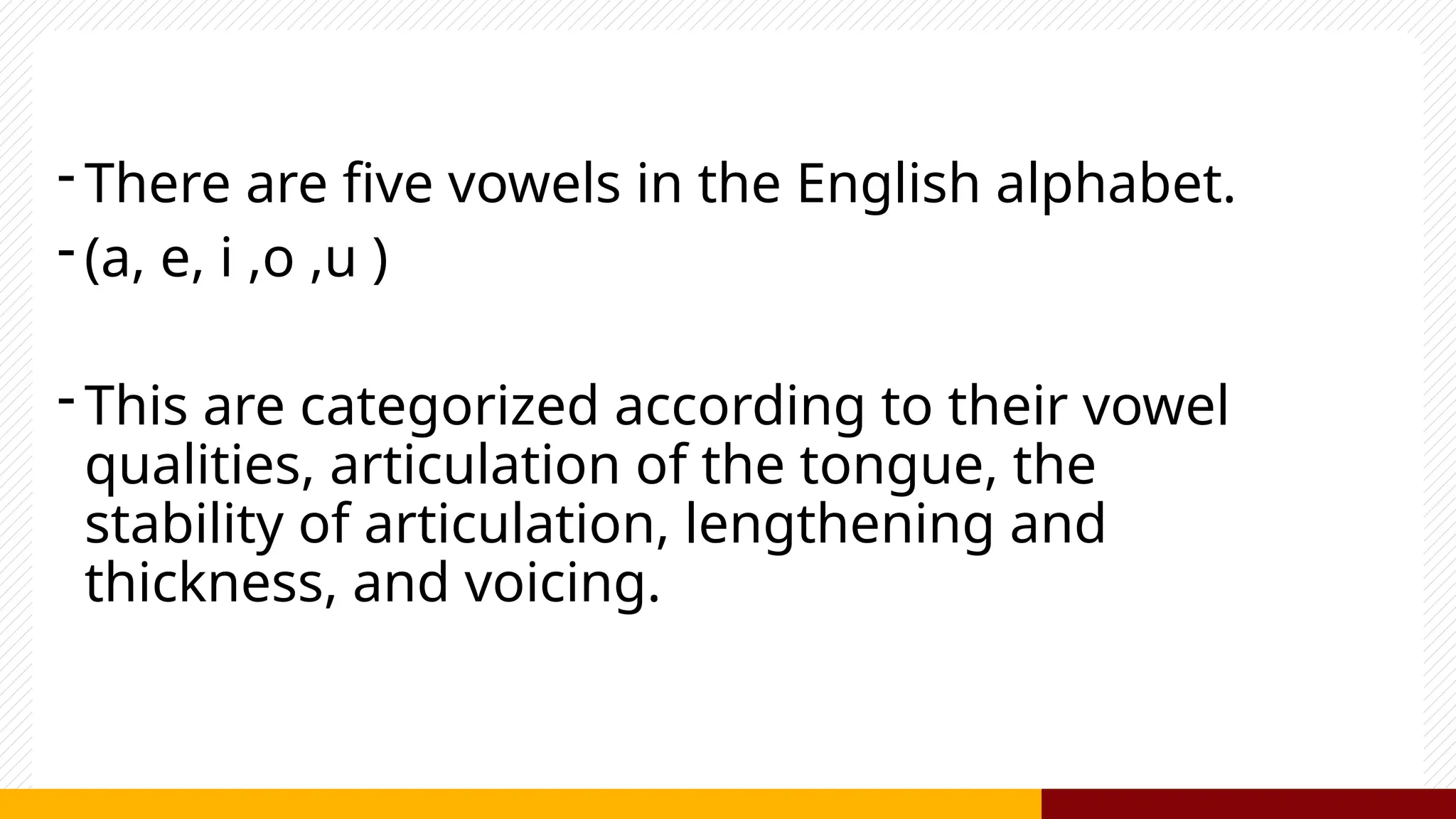 The document discusses the classification of English vowels, detailing five primary vowels (a, e, i, o, u) based on articulation, tongue position, and lip shape. Vowels are categorized into rounded and unrounded types depending on lip shape, while tongue position is described through concepts of height and part raised. Primary and secondary cardinal vowels are outlined, indicating their relationships and characteristics of sound production.
