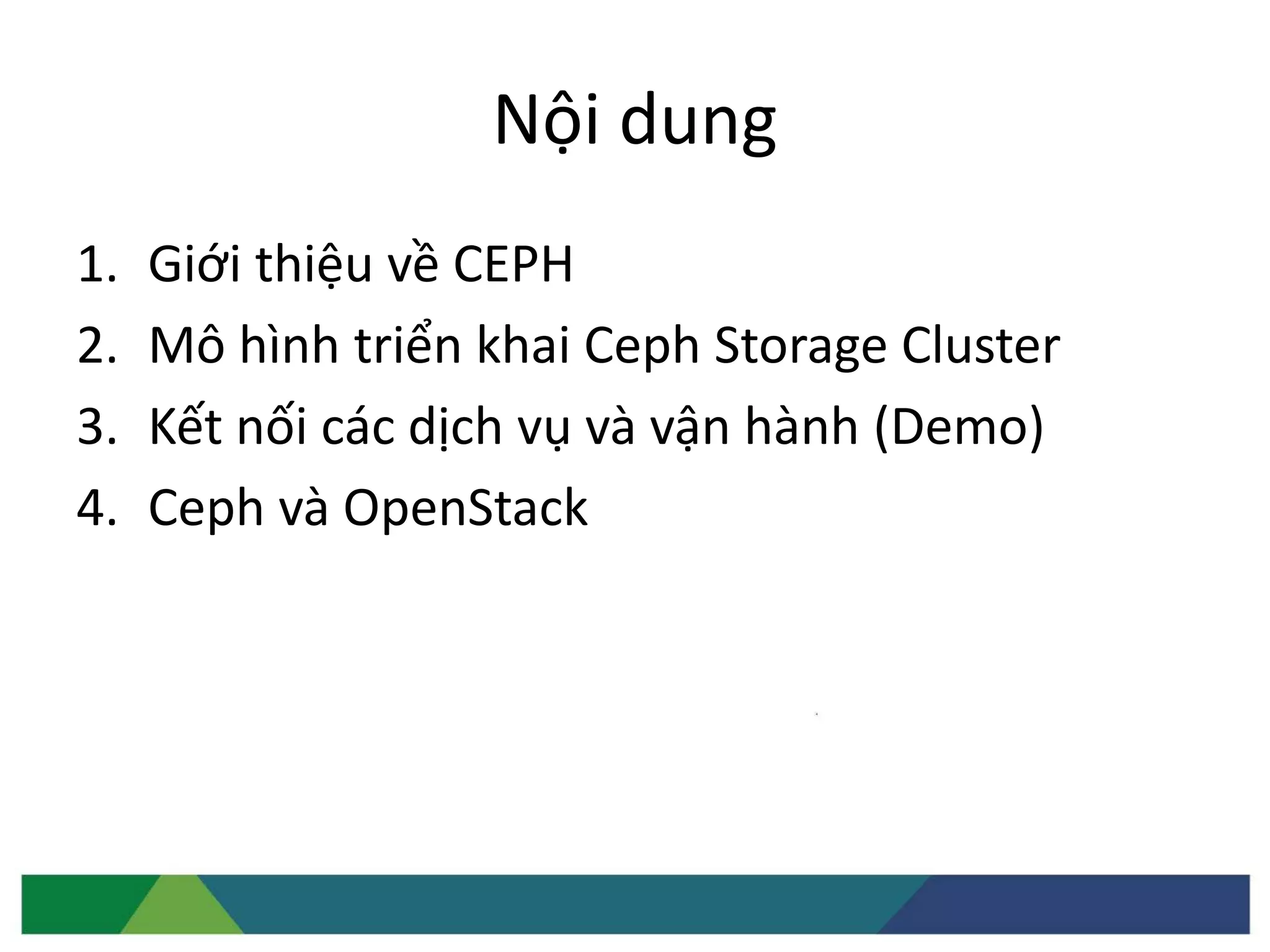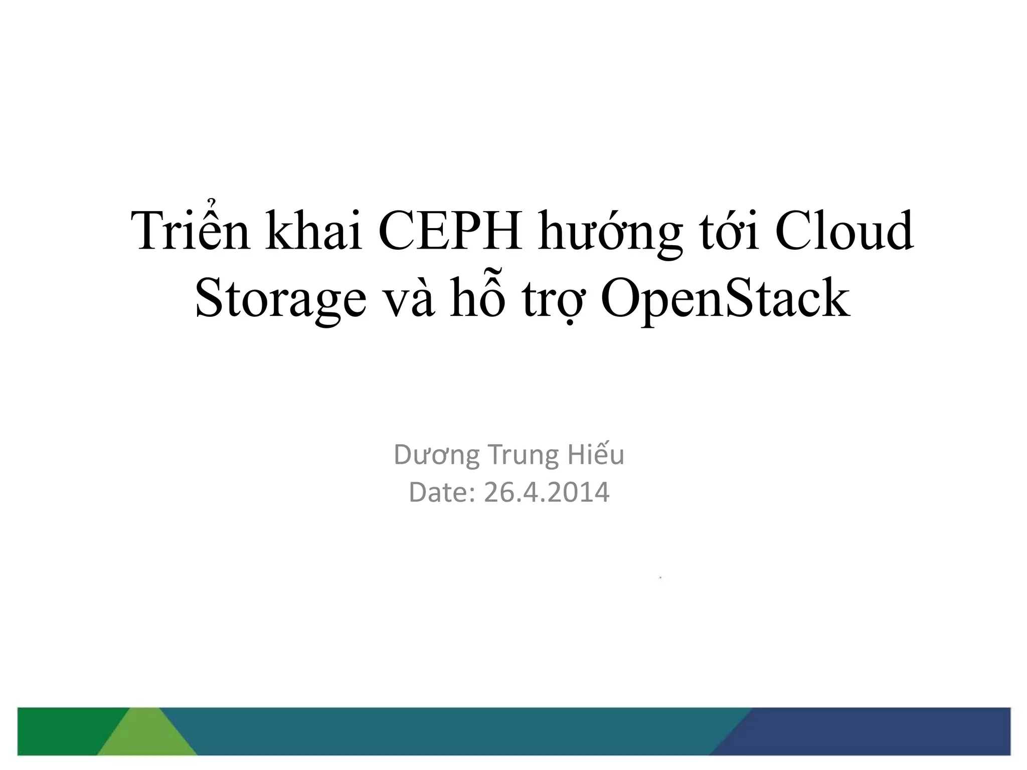 Tài liệu trình bày về Ceph, một giải pháp lưu trữ phân tán mã nguồn mở, và mô hình triển khai Ceph storage cluster kết hợp với OpenStack. Ceph cung cấp khả năng mở rộng, độ tin cậy cao và tự khôi phục lỗi, đồng thời hỗ trợ đa dạng các loại lưu trữ như đối tượng, khối và tệp. Nó được sử dụng để phát triển lưu trữ đám mây và triển khai các dịch vụ có độ khả dụng cao.