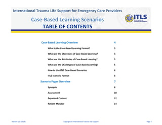 The document outlines the International Trauma Life Support (ITLS) case-based learning scenarios aimed at enhancing trauma care for emergency providers. It details the objectives, attributes, challenges of case-based learning, and provides guidelines for using ITLS scenarios effectively, including assessment and evaluation rubrics. Additionally, it emphasizes the importance of experiential learning and instructor-guided discussions to facilitate learner engagement and skill mastery.