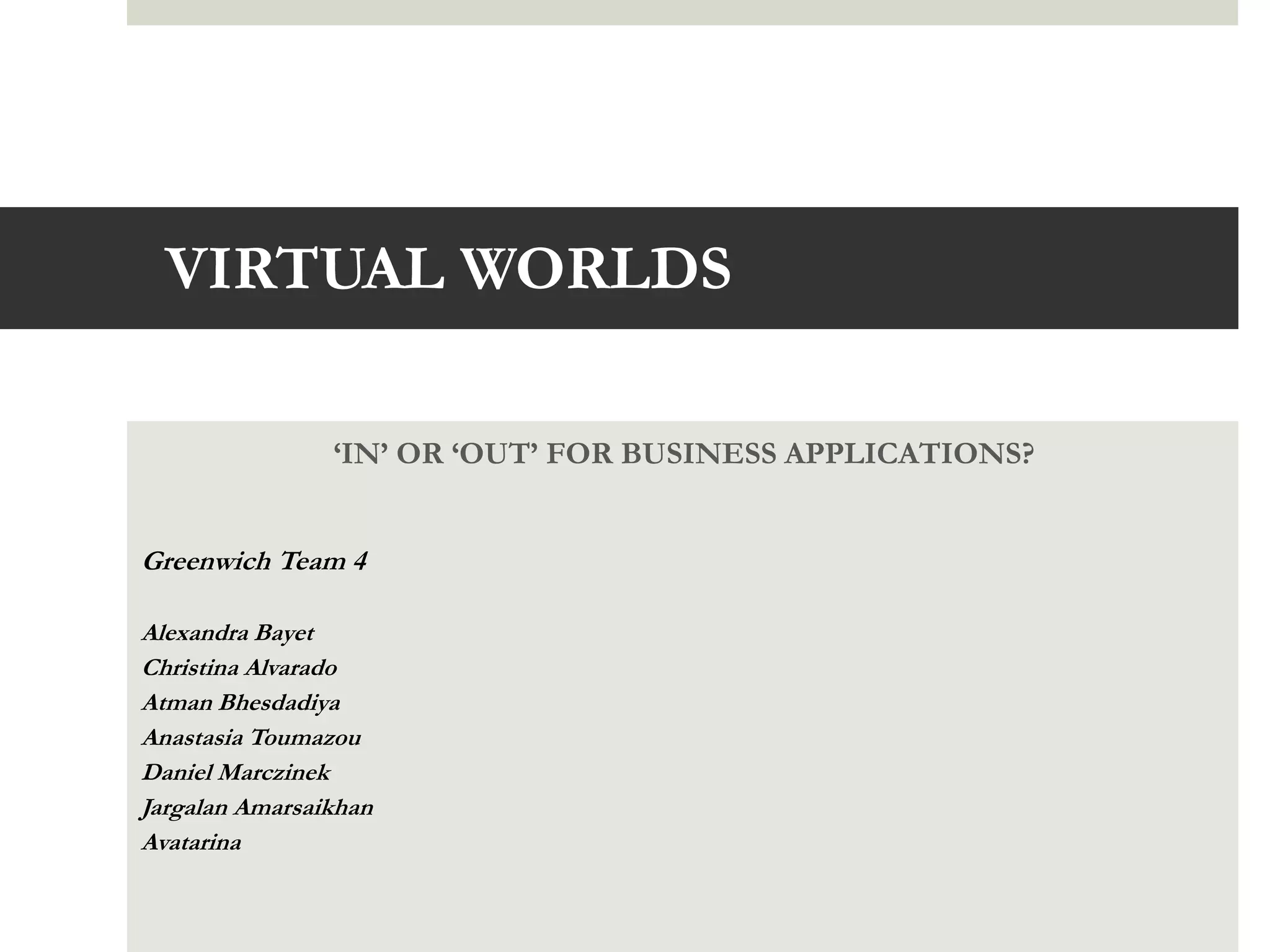 The document discusses the potential uses of virtual worlds for businesses. It outlines how various companies have used virtual worlds for applications such as sales, branding, advertising, education, recruitment, collaboration, training, and simulation. It also examines the technological, legal, organizational, and cultural issues associated with virtual worlds. Finally, it provides examples of how IBM has utilized different virtual world platforms for various purposes, including events, meetings, learning, and systems management.
