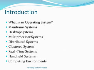 The document discusses different types of operating systems including mainframe systems, desktop systems, multiprocessor systems, distributed systems, clustered systems, real-time systems, and handheld systems. It provides details on each type such as mainframe systems using batch processing to reduce setup time. Multiprocessor systems can increase throughput and reliability through parallel processing. Distributed systems distribute computation across physical processors connected through a network. Real-time systems have well-defined time constraints and may be hard or soft depending on secondary storage limitations.
