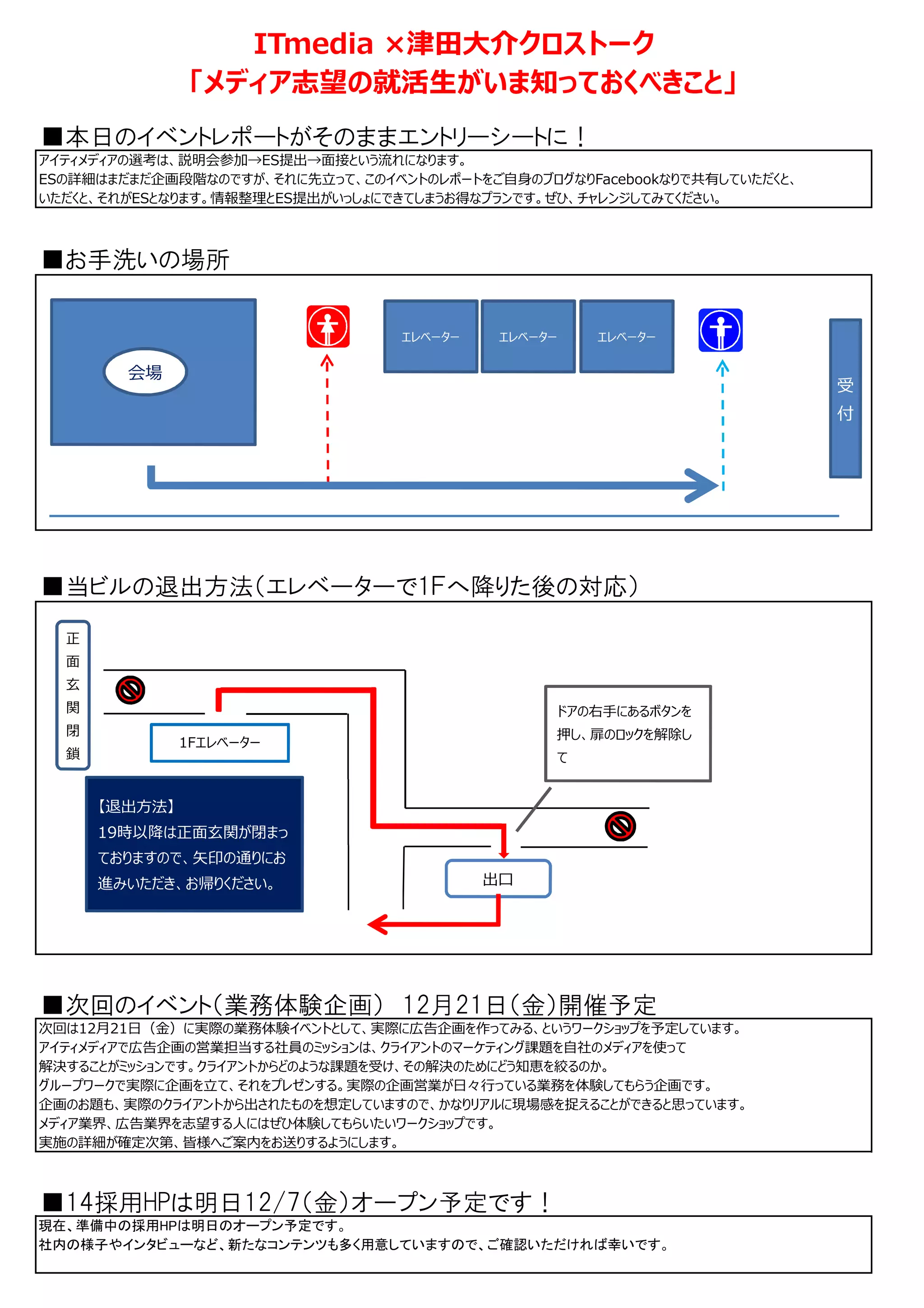「メディア志望の就活生がいま知っておくべきこと」 ■本日のイベントレポートがそのままエントリーシートに! アイティメディアの選考は、説明会参加→ES提出→⾯接という流れになります。 ESの詳細はまだまだ企画段階なのですが、それに先⽴って、このイベントのレポートをご⾃⾝のブログなりFacebookなりで共有していただくと、 いただくと、それがESとなります。情報整理とES提出がいっしょにできてしまうお得なプランです。ぜひ、チャレンジしてみてください。 ■お手洗いの場所 エレベーター エレベーター エレベーター 会場 受 付 ■当ビルの退出方法(エレベーターで1Fへ降りた後の対応) 正 面 玄 関 ドアの右手にあるボタンを 閉 押し、扉のロックを解除し 1Fエレベーター 鎖 て 【退出方法】 19時以降は正⾯⽞関が閉まっ ておりますので、矢印の通りにお 進みいただき、お帰りください。 出口 ■次回のイベント(業務体験企画) 12月21日(金)開催予定 次回は12⽉21⽇(⾦)に実際の業務体験イベントとして、実際に広告企画を作ってみる、というワークショップを予定しています。 アイティメディアで広告企画の営業担当する社員のミッションは、クライアントのマーケティング課題を自社のメディアを使って 解決することがミッションです。クライアントからどのような課題を受け、その解決のためにどう知恵を絞るのか。 グループワークで実際に企画を⽴て、それをプレゼンする。実際の企画営業が⽇々⾏っている業務を体験してもらう企画です。 企画のお題も、実際のクライアントから出されたものを想定していますので、かなりリアルに現場感を捉えることができると思っています。 メディア業界、広告業界を志望する人にはぜひ体験してもらいたいワークショップです。 実施の詳細が確定次第、皆様へご案内をお送りするようにします。 ■14採用HPは明日12/7(金)オープン予定です! 現在、準備中の採用HPは明日のオープン予定です。 社内の様子やインタビューなど、新たなコンテンツも多く用意していますので、ご確認いただければ幸いです。