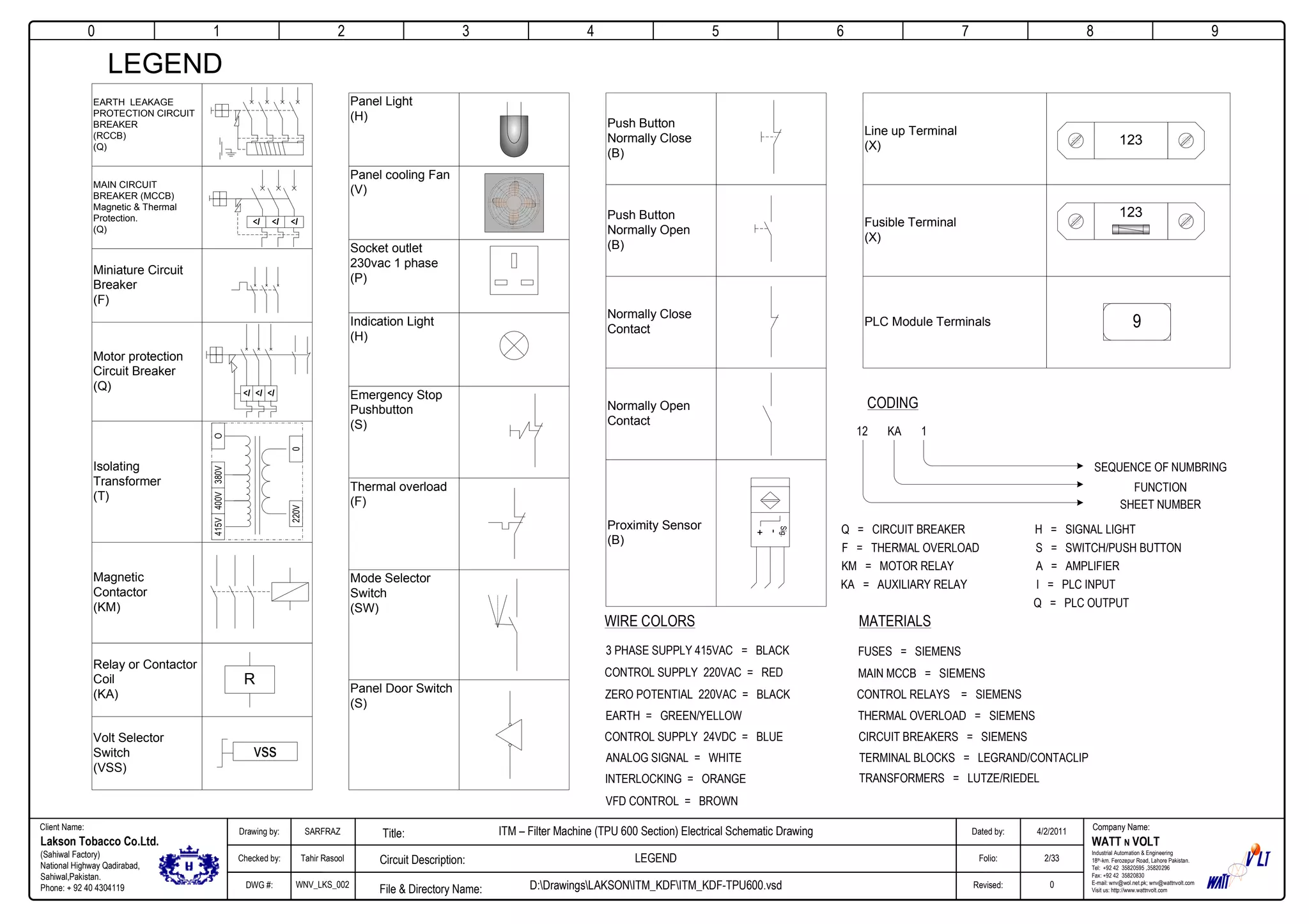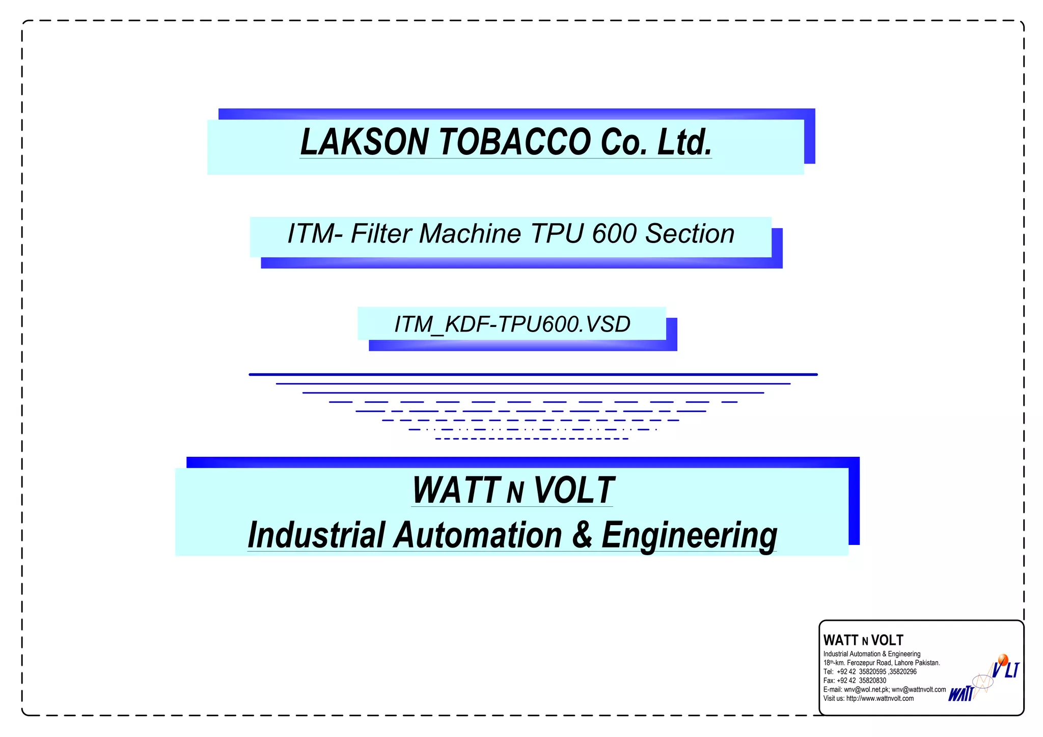 This document is an electrical schematic drawing for the TPU 600 section of an ITM filter machine for Lakson Tobacco Co. Ltd. It shows the main incoming power circuit including the isolation transformer, motor circuits including VFD drives for motors 1-3 and direct online connection for the plasticizer pump motor, and control circuits including connections to the PLC. Component labels and wiring are clearly indicated.