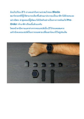 เราเคยเล่าถึงความน่าสนใจของ Blocks สมาร์ทวอทช์ที่ผู้ใช้สามารถเลือกชิ้นส่วนมาประกอบเป็นนาฬิกาได้ด้วยตนเอง อย่างอิสระ ล่าสุดตอนนี้ผู้พัฒนาได้เปิดตัวอย่างเป็นทางการพร้อมให้ Pre- Order เจ้านาฬิกาเรือนนี้แล้วนะครับ โดยหน้าตามีความแตกต่างจากคอนเซปส์เมื่อ 2 ปีก่อนพอสมควร แต่ว่ายังคงคอนเซปส์เรื่องการถอดสายเปลี่ยนฮาร์ดแวร์ไว้อยู่เช่นเดิม
