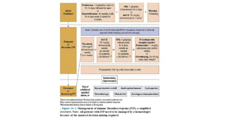 Immune thrombocytopenic purpura (ITP) is an acquired autoimmune disorder where platelets are destroyed by the immune system. It presents with bruising and low platelet counts. Treatment depends on severity but includes corticosteroids, intravenous immunoglobulin, anti-D immunoglobulin, splenectomy, thrombopoietin receptor agonists, and rituximab. Management involves raising platelet counts to prevent bleeding while considering the underlying cause, risk of side effects, and the chronicity of ITP in selecting treatments.