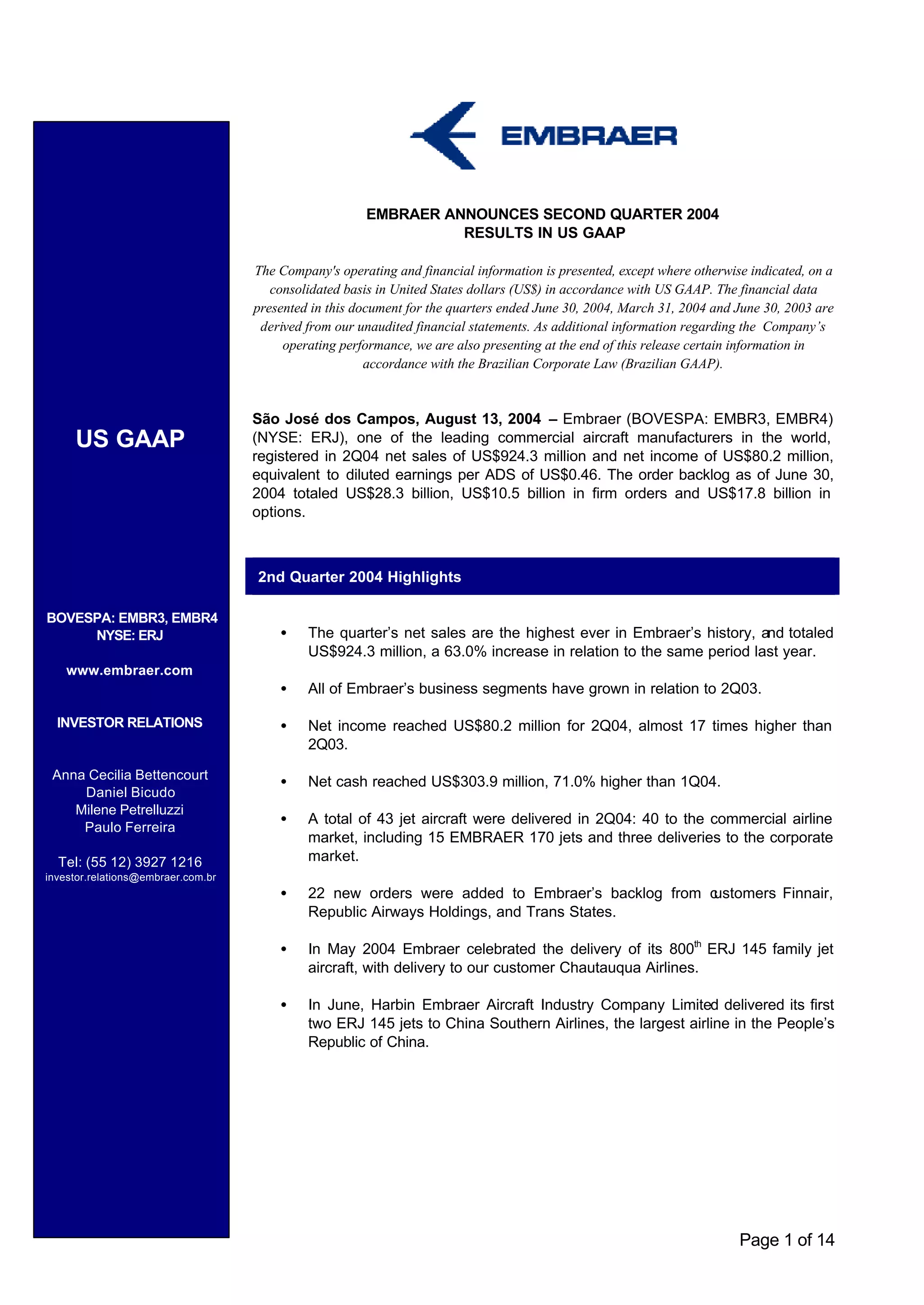 - Embraer announced its second quarter 2004 results reported under US GAAP, registering record net sales of $924.3 million and net income of $80.2 million.