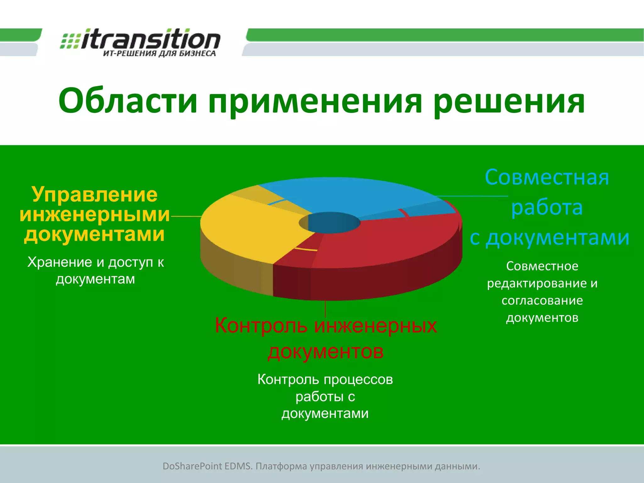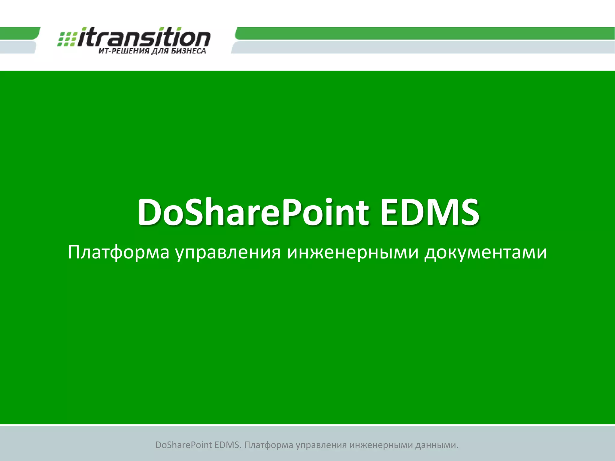 Документ описывает платформу управления инженерными данными dosharepoint edms, которая обеспечивает совместное управление, хранение и доступ к инженерным документам. Платформа предлагает возможности быстрого доступа, пакетной обработки и просмотра чертежей, а также механизмы для сравнения и аннотирования документов. Среди ключевых функций выделяются массовый импорт, управление задачами и создание renditions для упрощения работы с документами.