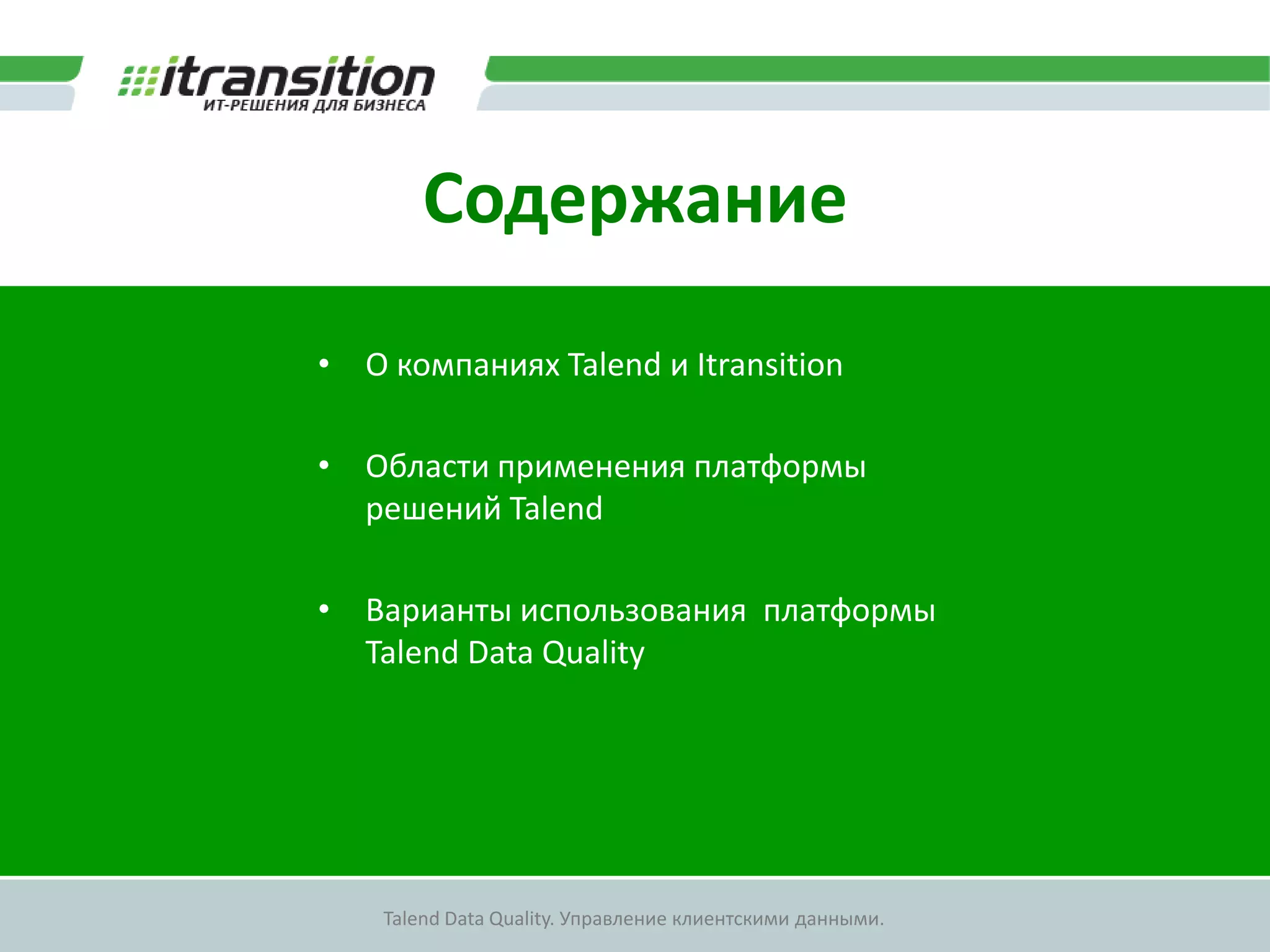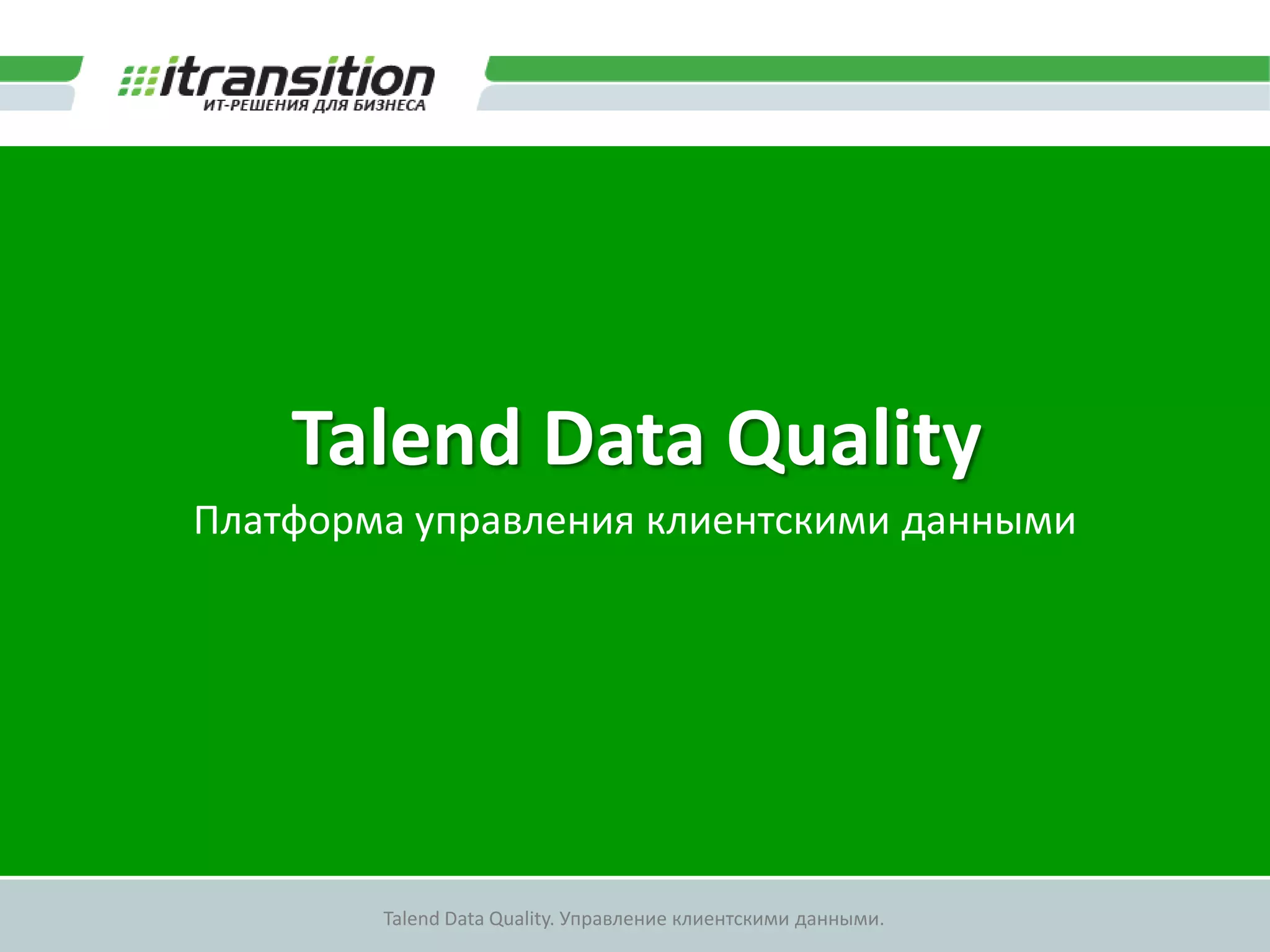 Документ описывает платформу Talend Data Quality, используемую для управления клиентскими данными и поддержания их качества. В нем представлены различные области применения и возможности платформы, включая интеграцию данных и контроль качества. Также упоминается компания Itransition, ее достижения на рынке и статистика использования решений Talend.