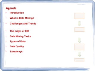 3) It outlines several common data mining tasks like classification, clustering, association rule mining and sequential pattern mining.