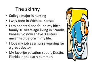 Cherie was born in Wichita, Kansas and adopted. She recently found her birth family who lives in Scandia, Kansas, giving her three new sisters. She works as a nurse for a great doctor and enjoys vacationing in Destin, Florida in early summer. Her 5-year plan includes achieving financial freedom, reading the entire bible, taking a Caribbean vacation, and graduating as a registered nurse from ASUMH. Her goals for the next 10 years are to remain financially independent, use her nursing skills to help third world countries through mission trips to Africa and Purue, and build an addition onto her house.