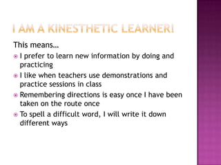Jesse Cooper prefers to learn by doing and practicing. He likes when teachers use demonstrations and practice sessions in class. Once shown directions once, remembering them is easy for Jesse. To spell difficult words, he writes them down different ways.
