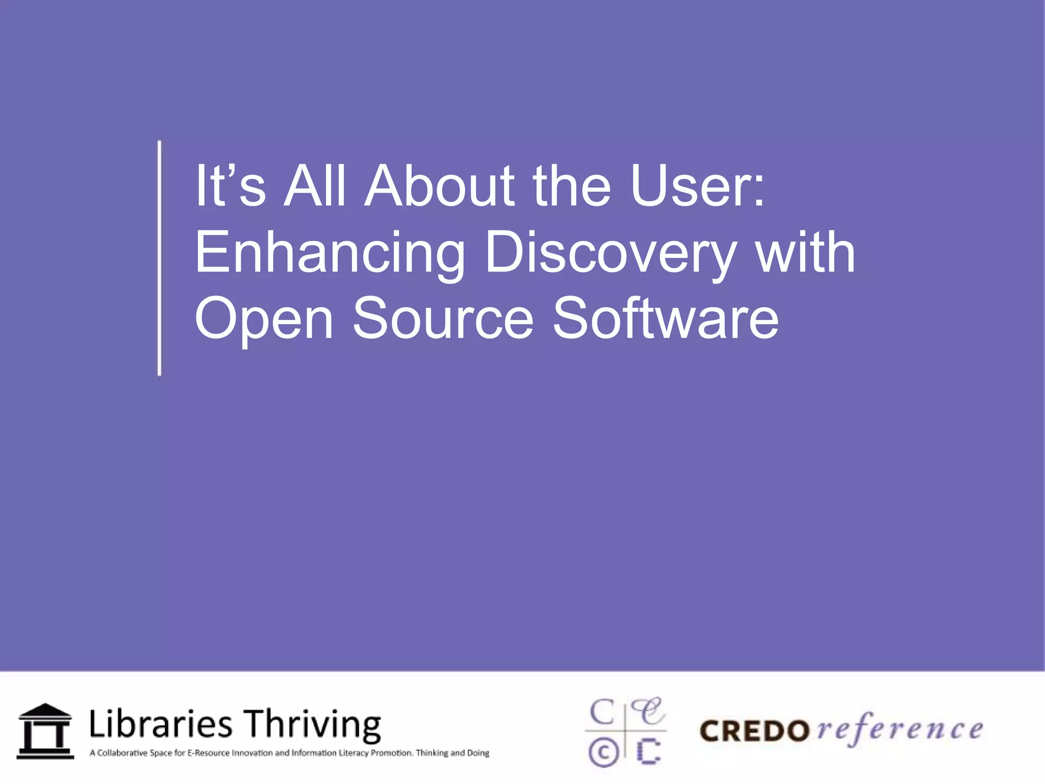 The document outlines best practices for enhancing user discovery using open source software, as discussed in a webinar by Lisabeth Chabot and Ron Gilmour. It encourages interaction through comments in the chat box, participation in a discussion forum, and requests for professional development certificates via email. The webinar took place in August 2012 at Ithaca College.