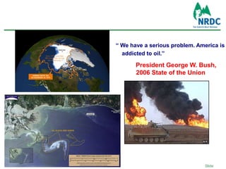 This document discusses strategies to reduce transportation sector emissions in the United States. It notes that transportation accounts for 27% of total US emissions and over half of emissions from passenger vehicles. The document outlines strategies to improve vehicle efficiency through increased fuel economy standards and use of low-carbon fuels. It also discusses opportunities to improve system efficiency through better transportation, land use, and infrastructure planning. These strategies could reduce transportation emissions by 17-38% by 2020 and up to 80% by 2050 according to analysis by the Natural Resources Defense Council.